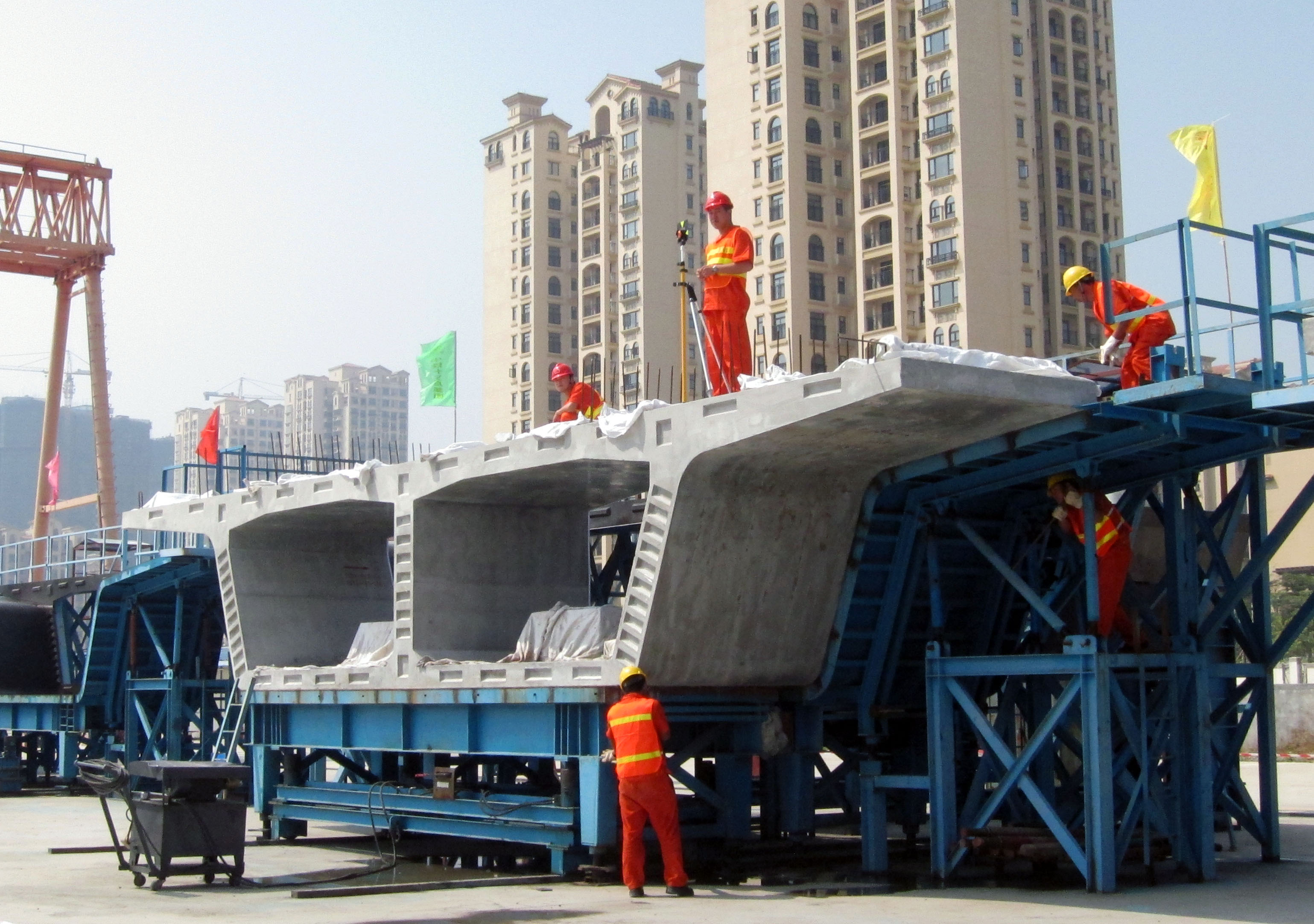 Para além disso, no decurso do fabrico é exigida uma precisão rigorosa para as peças pré-fabricadas que são consideradas como parte constituinte importante da estrutura principal do viaduto do Metro Ligeiro, sendo que o empreiteiro vai proceder, antes do fabrico e após a conclusão, à inspecção individual de cada peça pré-fabricada através de instrumentos de precisão, de modo a garantir a correspondência entre as peças pré-fabricadas concluídas e o respectivo projecto; por seu turno, o GIT vai fiscalizar e examinar rigorosamente cada procedimento do processo de fabrico, recorrendo a organismos independentes, nomeadamente as entidades responsáveis pela fiscalização da empreitada e pelo controlo de qualidade, para que a construção do viaduto do Metro Ligeiro possa atingir os padrões internacionais do ponto de vista técnico e da qualidade .