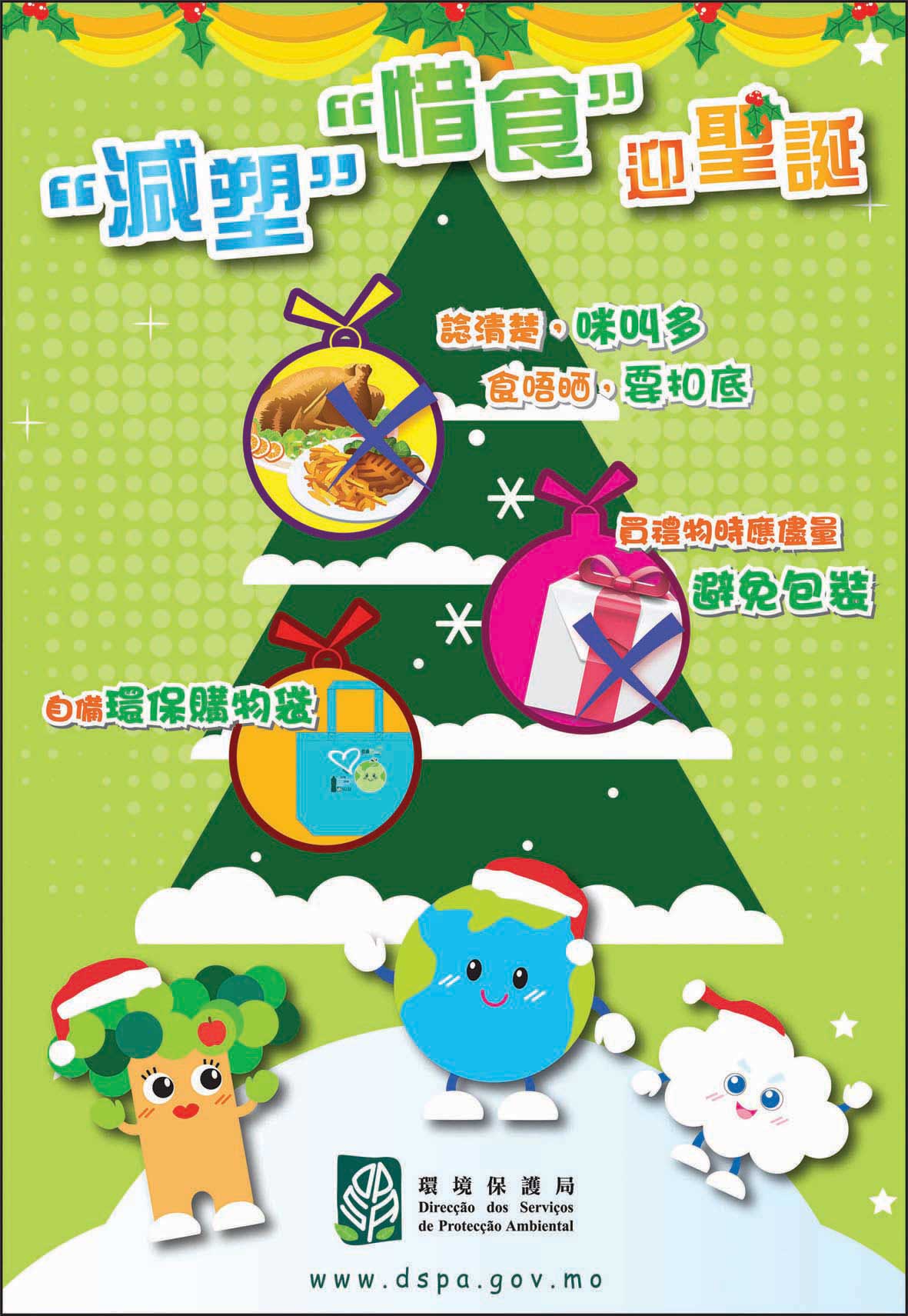 A festa de Natal que se celebra anualmente está a chegar. Há muitas pessoas que já estão a organizar as suas festas? A Direcção dos Serviços de Protecção Ambiental (DSPA) apela à população para, ao mesmo tempo que se celebra a grande festa, actuar no sentido de apoiar a preservação do ambiente, nomeadamente a valorizar os alimentos, levar e utilizar o próprio saco ecológico nas compras, evitar usar os sacos de plástico, actuando no sentido de, conjuntamente, “Reduzir o uso de sacos de plástico e valorizar alimentos no Natal”.