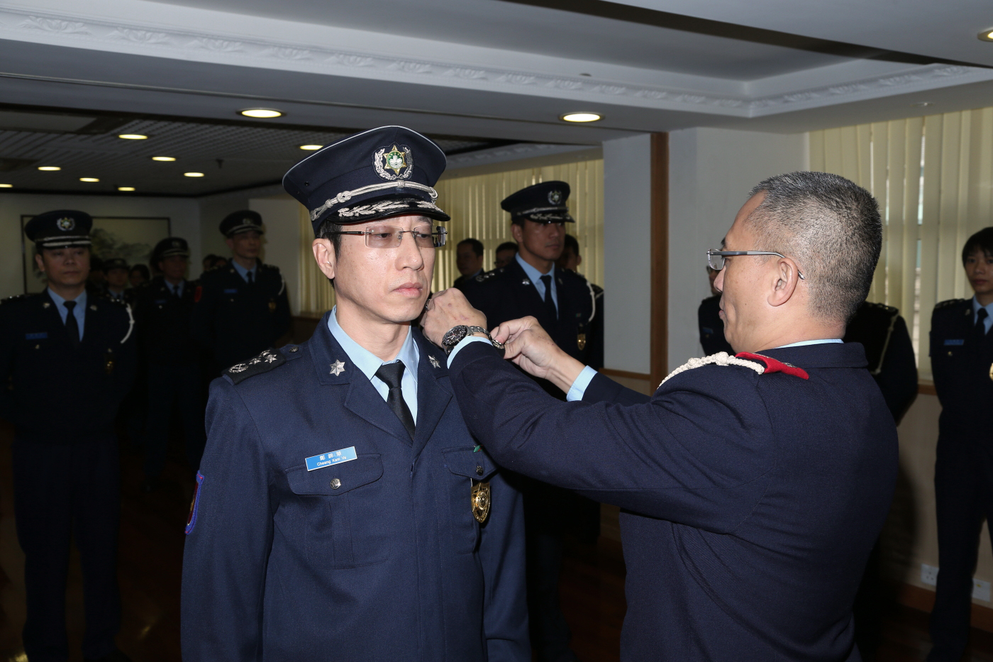 Na presente cerimónia de promoção ao posto de Intendente foram promovidos três oficiais, Cheang Kam va, Ng Kam Wa e Leong Seac Man ambos os três promovidos frequentaram o 1.° e o 2.° Curso de Formação de Oficiais da Escola Superior das Forças de Segurança de Macau, concluíram os referidos cursos e foram promovidos a subcomissário respectivamente em 1995 e 1996 e, posteriormente, desempenharam funções de chefia em vários departamentos desta Polícia. Os três oficiais superiores têm ambos conhecimentos profissionais e rica experiência de serviço, excepcionais qualidades de trabalho e foram, ainda, promovidos e louvados por várias vezes. Antes da presente promoção, os três oficiais exerciam, respectivamente, o cargo do Chefe Subst.° dos Serviços de Migração, o Comandante Subst.° da Unidade Táctica de Intervenção desta Polícia e Chefe Subst.° do Departamento de Apoio Técnico da DSFSM.