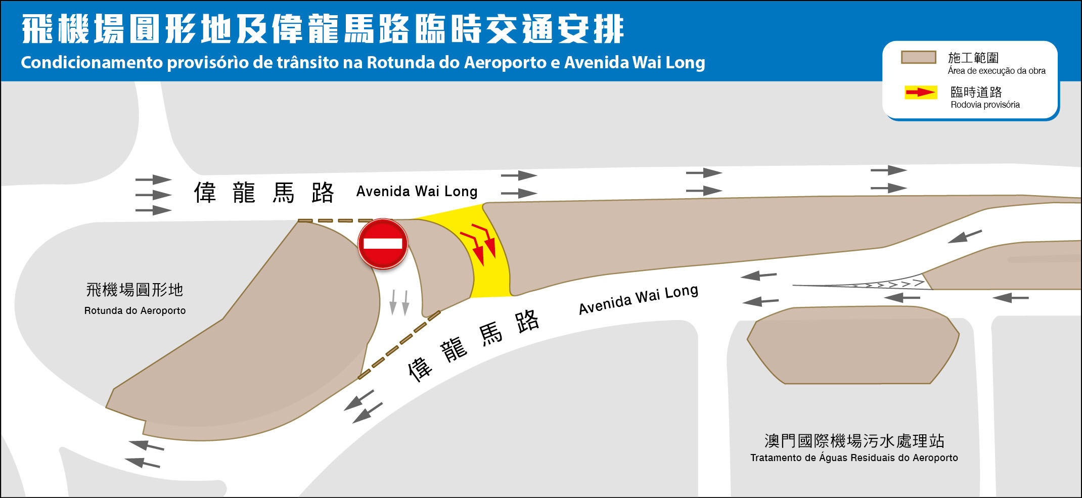 Com a conclusão do trabalho da elevação e montagem do primeiro troço do viaduto da obra do Metro Ligeiro, avança-se, de imediato, o passo em direcção ao Pac On. Com vista à coordenação da construção da próxima fase, entra em serviço, a partir de quinta-feira (dia 17), o novo acesso viário provisório, junto da Rotunda do Aeroporto. O Gabinete para as Infra-estruturas de Transportes (GIT) e a Direcção dos Serviços para os Assuntos de Tráfego (DSAT) apelam a atenção dos condutores, aperfeiçoando atempadamente os arranjos provisórios.