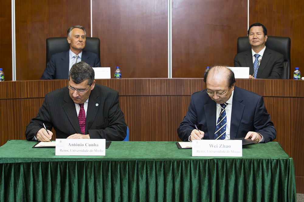 Na cerimónia realizada no novo campus da UM, o Presidente da República Portuguesa, Cavaco Silva, o Ministro de Estado e dos Negócios Estrangeiros, Rui Machete, o Ministro da Educação e Ciência, Nuno Crato, o Secretário para os Assuntos Sociais e Cultura da RAEM, Cheong U, e o Vice-Reitor da UM, Rui Martins testemunharam a assinatura de dois memorandos de entendimento (MoU) entre a UM, representada pelo seu Reitor, Wei Zhao e duas instituições portuguesas: a Universidade de Lisboa, representada pelo seu Reitor, António da Cruz Serra e a Universidade do Minho, representada pelo seu Reitor, António Augusto Magalhães da Cunha. A UM tem vindo a manter uma boa cooperação com instituições de ensino superior portuguesas. A assinatura destes dois MoUs visa estreitar ainda mais os laços de cooperação entre os docentes, investigadores e faculdades da UM e das duas universidades portuguesas. No âmbito dos novos MoU, serão realizadas actividades tais como: intercâmbio de docentes para a realização de aulas, seminários, discussões académicas, projectos de investigação científica e a orientação de alunos; intercâmbio de alunos para a frequência de aulas; desenvolvimento conjunto de planos curriculares; colaboração entre docentes e alunos em projectos de investigação. As áreas principais focadas nestes acordos são as de Estudos Portugueses (nas Universidades Portuguesas), e Estudos Chineses e Asiáticos (na Universidade de Macau).