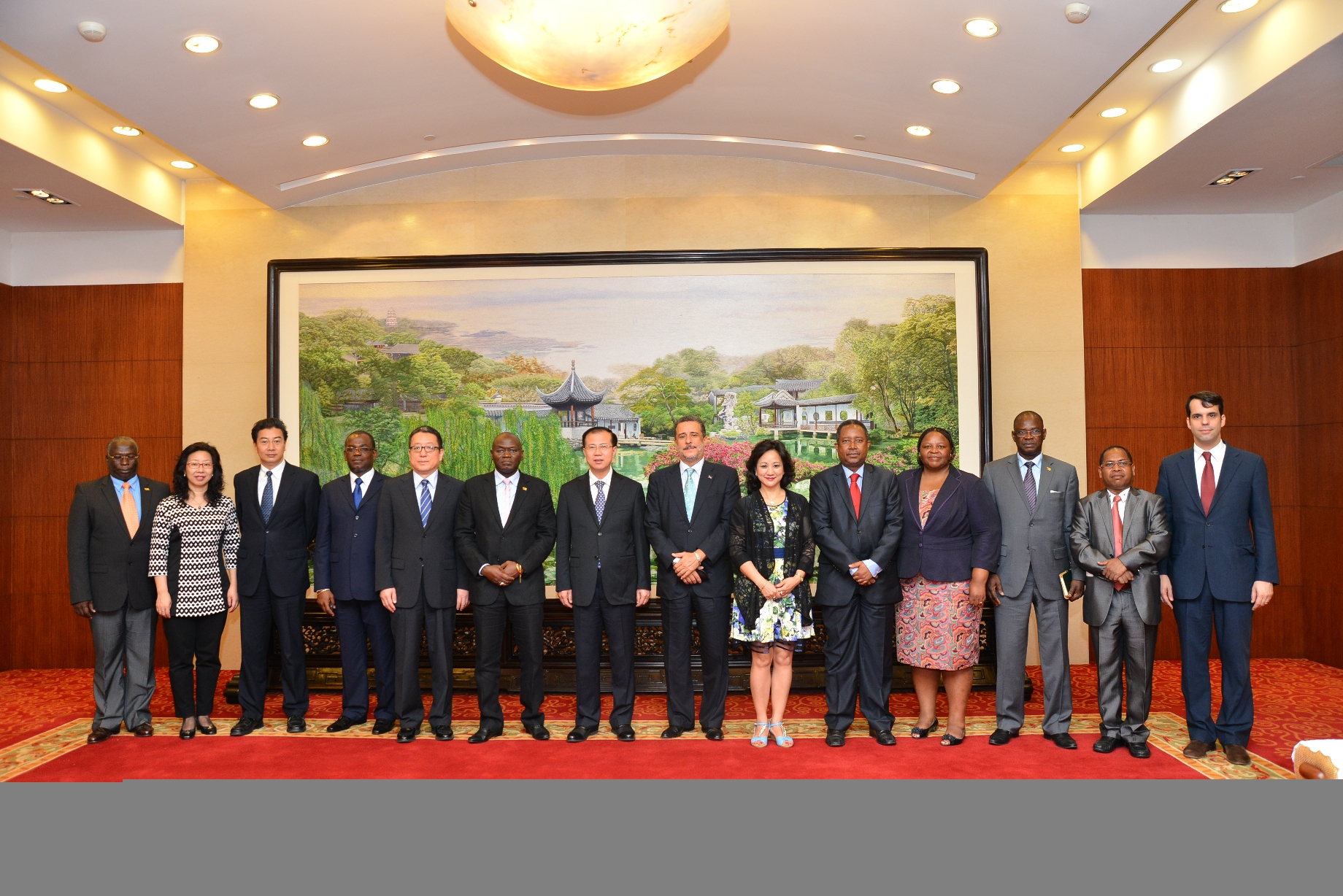 Teve lugar, na manhã do dia 13 de Junho, um encontro entre o Governo da Província de Jiangsu, representantes diplomáticos dos Países de Língua Portuguesa na China e membros do Secretariado Premanente do Fórum de Macau, nomeadamente o Vice-Governador da Província de Jiangsu, Dr. Fu Ziying, o Embaixador de Cabo Verde em Pequim, Dr. Júlio Morais, o Embaixador de Guiné-Bissau em Pequim, Dr. Malam Sambú, e da parte do Secretariado Permanente do Fórum de Macau, o Sectetário-Geral, Dr. Chang Hexi, Sectetário-Geral Adjunto, Dr. Marcelo D'Almeida, Sectetária-Geral Adjunta e Coordenadora do Gabinete de Apoio, Dra. Rita Santos, Coordenadora do Gabinete de Administração, Dra. Zhangjie, o Coordenador do Gabinete de Ligação e Delegado de Angola, Dr. Joaquim Gama, o Cônsul para os Assuntos Económicos e Comerciais do Consulado de Portugal em Xangai, Dr. Filipe Costa, Delegado de Guiné-Bissau, Eng. Malam Camará, 1a. Secretária da Embaixada de Moçambique em Pequim, Dra. Clara Sengo, 2o. Secretário da Embaixada de Guiné-Bissau em Pequim, Dr. José Camará, e o 2o. Secretário da Embaixada de Timor-Leste em Pequim, Dr. Faustino Freitas.