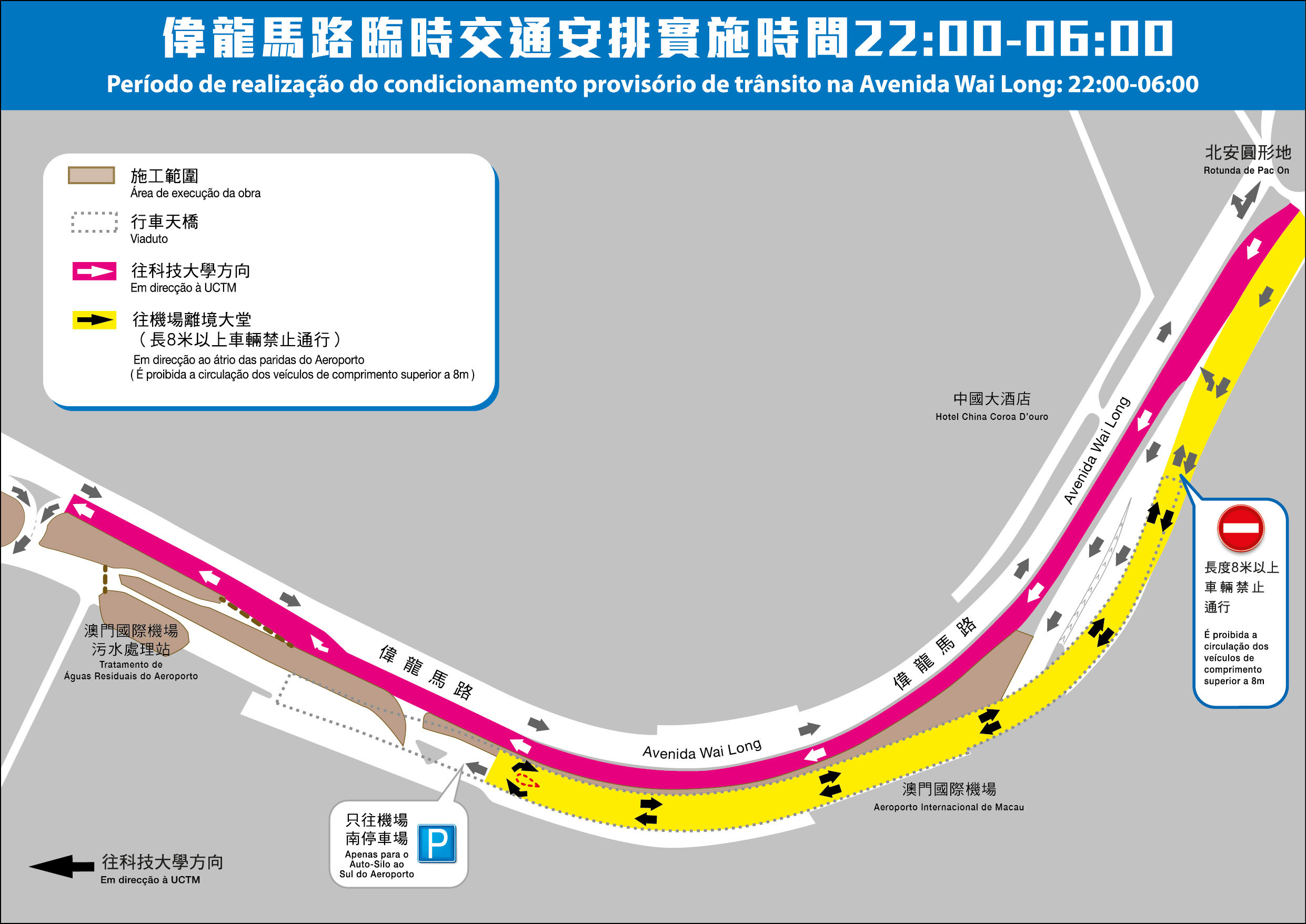 Os dois suportes do viaduto do Metro Ligeiro da Avenida Wai Long da Taipa já foram construídos pelo que é preciso demolir os andaimes à volta daqueles. Tendo em consideração a segurança na circulação de veículos na avenida em questão durante a demolição, um troço da Avenida Wai Long, junto da Estação de Tratamento de Águas Residuais do Aeroporto, será temporariamente encerrado na quarta (dia 25) e quinta-feira (dia 26) à noite, das 22:00 às 06:00. Durante este período, o viaduto junto do Aeroporto Internacional de Macau permitirá apenas a circulação dos veículos que vão ao átrio das partidas do aeroporto ou ao parque de estacionamento situado a sul do aeroporto. Quanto aos veículos de comprimento superior a 8 metros e aos veículos ligeiros que circularem na Rotunda de Pac On, em direcção à Universidade de Ciência e Tecnologia, os mesmos passarão a circular na faixa de rodagem inferior da Avenida Wai Long.