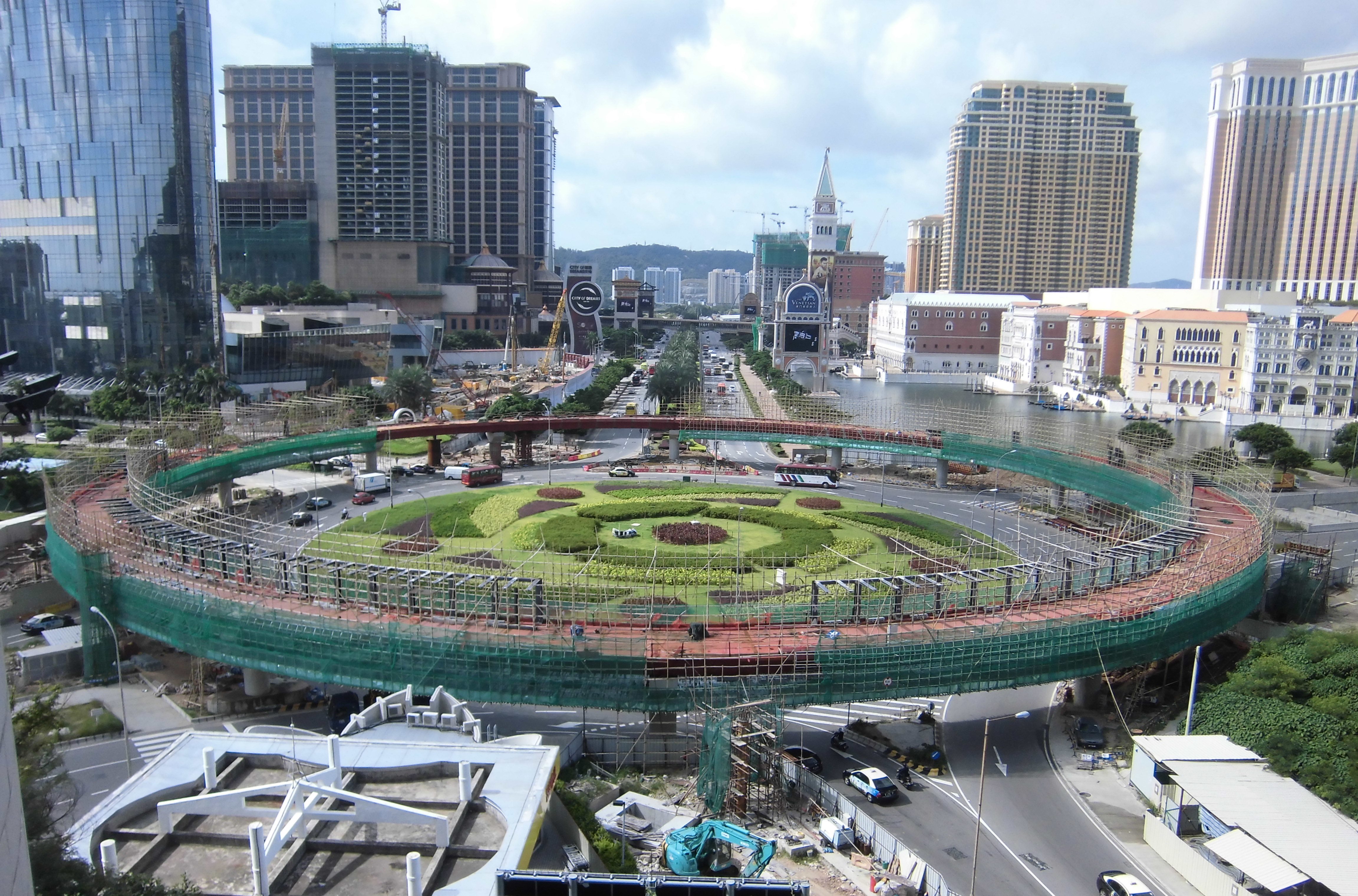 A presente empreitada iniciou-se no terceiro trimestre do ano passado. Desde o começo, em Janeiro do corrente ano, os trabalhos de elevação e montagem das vigas caixão estruturais em aço, subdivididas em 14 secções, têm vindo a ser executados com o apoio de gruas em grande capacidade e em horários programados, para se conseguir a constituição gradual de um tabuleiro circular de 62 metros de raio, 391 metros de comprimento e 6 metros de largura. Hoje (dia 18) com a execução da elevação e montagem da última secção da viga caixão da principal estrutura da passagem, o tabuleiro da passagem superior para peões encontra-se realmente completo. Na próxima fase, os trabalhos concentrar-se-ão no impulsionamento em plenitude da estruturação dos pontos de encontro da passagem para peões, acabamentos do tabuleiro, instalação dos equipamentos e configurações electromecânicas. Actualmente, encontra-se já executada a cravação das estacas nos cinco pontos de encontro, estando em execução os trabalhos das fundações e pilares, com o início também, de uma forma ordenada, dos acabamentos do tabuleiro, instalação dos equipamentos e configurações electromecânicas. Prevê-se que toda a empreitada possa ser entregue e ter o funcionamento experimental no primeiro trimestre de 2015.