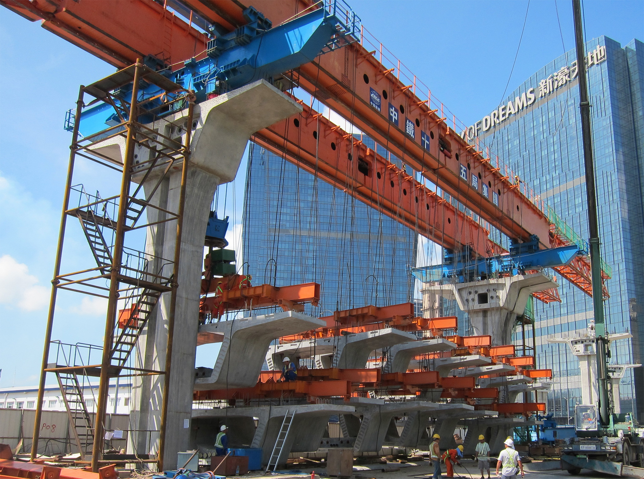 No mês anterior, chegaram gradualmente a Macau as respectivas peças da segunda máquina de instalação das peças pré-fabricadas, a qual é também utilizada para construção do Segmento do Posto Fronteiriço da Linha da Taipa. Depois de cerca de um mês da montagem e ensaios efectuados pela terceira entidade independente, espera-se que a mesma possa entrar em funcionamento no início de Setembro. Esta máquina de instalação das peças pré-fabricadas tem como principal responsabilidade elevar e montar cerca de 20 troços do viaduto que se encontram entre a Rotunda da Universidade de Ciências e Tecnologia e a Avenida do Aeroporto, sendo ligadas mais de 200 peças pré-fabricadas. Tendo em conta que a avenida supre mencionada é relativamente vasta e recta, a aplicação do método da elevação e montagem das peças pré-fabricadas não só aumenta efectivamente a eficiência de execução das obras, mas também diminui as programações do transporte, sendo aliviada a pressão de trânsito. Por outro lado, o empreiteiro prevê que devido à execução em simultâneo da obra pela outra máquina de instalação das peças pré-fabricadas na Av. Wai Long, será acelerado o trabalho da elevação e montagem do viaduto de todo o segmento, favorecendo deste modo o desenvolvimento do procedimento da próxima fase, isto é, a construção de guarda-corpos nos dois lados.
