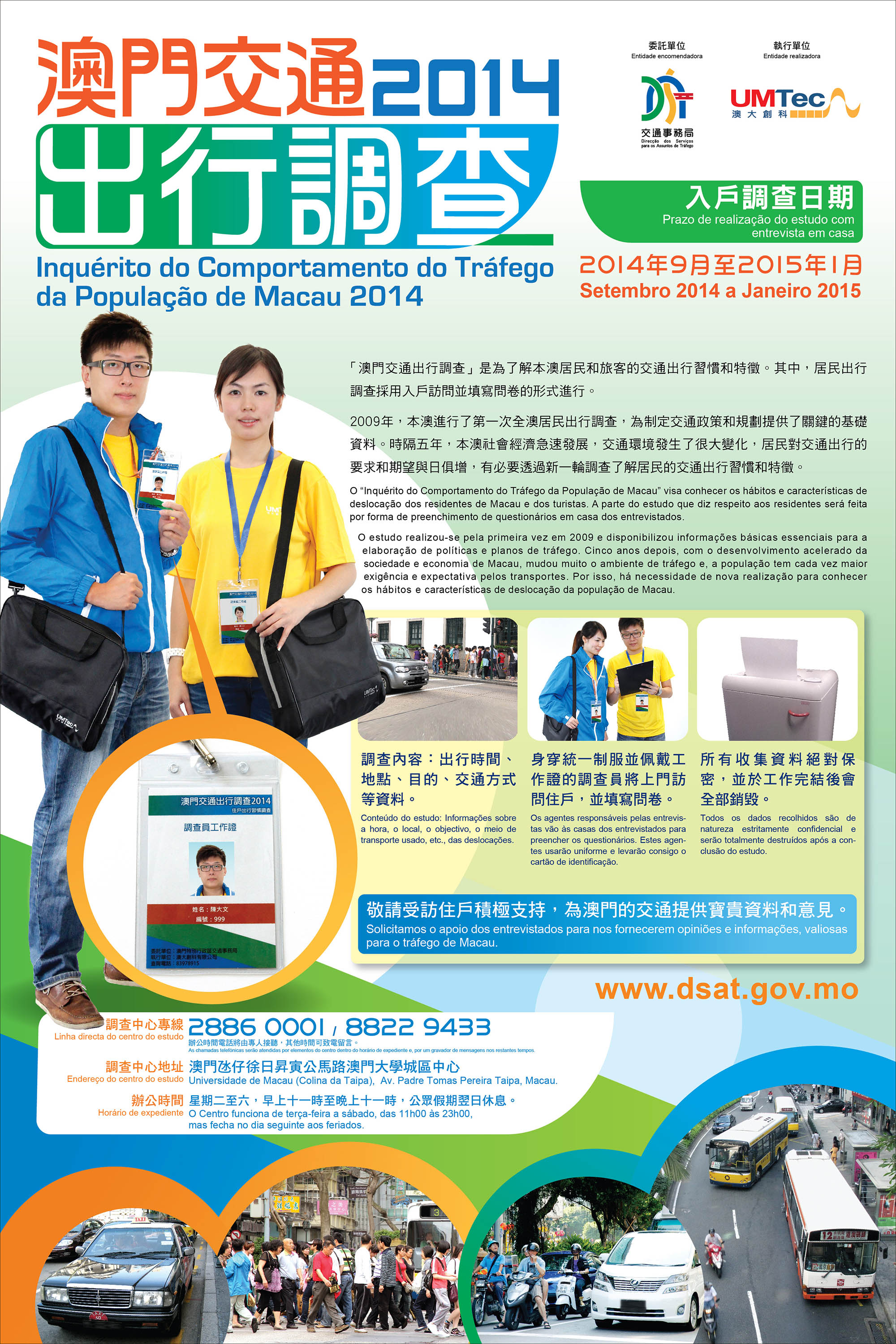 A DSAT solicita o apoio dos entrevistados para a prestação de opiniões e informações, valiosas para o desenvolvimento do tráfego de Macau. Todos os dados recolhidos são de natureza estritamente confidencial e serão totalmente destruídos após a conclusão do inquérito. Para mais informações, ligue para a linha directa 2886 0001 ou 8822 9433 do centro, de terça-feira a sábado, entre 11h00 e 23h00.