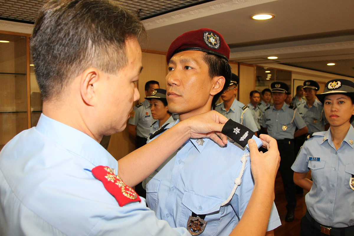 Hoje, dia 20 de Outubro de 2014, pelas 12H00, teve lugar na Sala de Honra do Comando do Corpo de Polícia de Segurança Pública, a cerimónia de promoção ao posto de Chefe, que foi presidida pelos Exm.os Comandante do CPSP, Superintendente Geral Ma Io Kun, e 2.os Comandantes, Superintendente Lai Kam Kun e Superintendente Mui San Meng. A cerimónia contou ainda com a presença das chefias e responsáveis de vários Departamentos desta Polícia. Foram promovidos no total de 29 Chefes, entre os quais 28 da Carreira Ordinária (23 masculinos e 5 femininos), e 1 masculino da Carreira de Músicos.