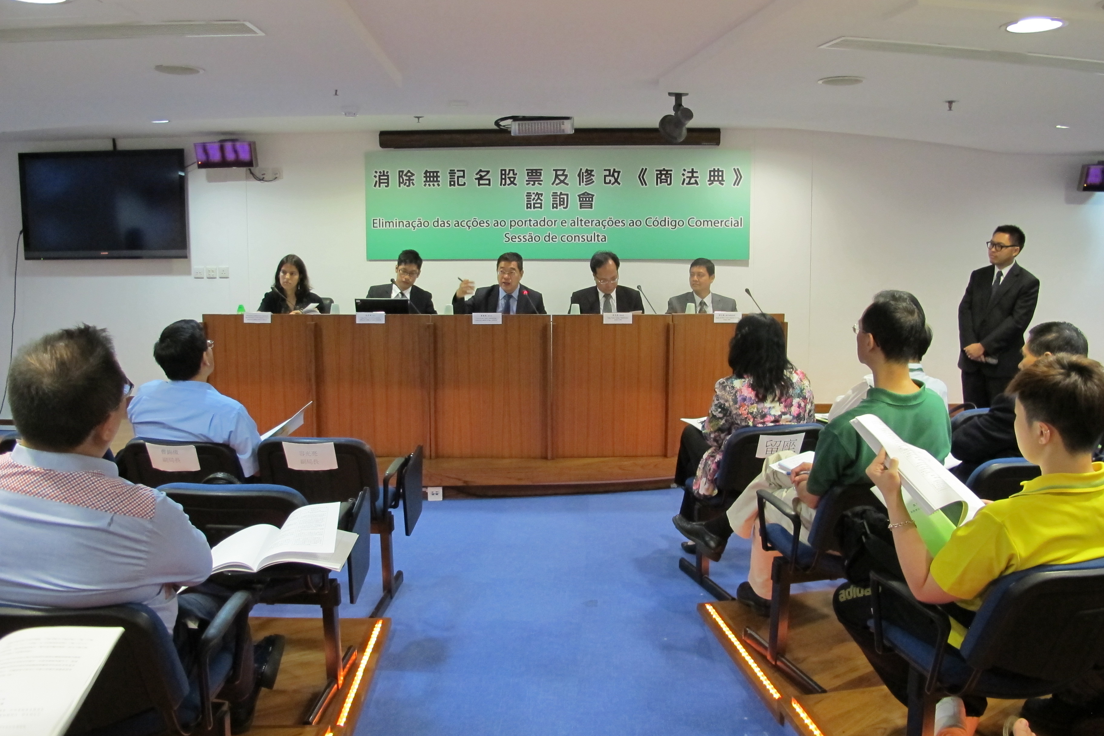 A sessão de consulta iniciou-se com a apresentação sobre o conteúdo de alteração constante do documento de consulta feita pelo Chefe da Divisão de Produção Normativa de Direito Público da DSRJDI, Lam Wai Lon, apontando que se pretende auscultar, de forma ampla, as opiniões e sugestões de todos os sectores da sociedade, durante o período de consulta pública, de 10 de Outubro a 8 de Novembro, sobre a eliminação das acções ao portador e alterações ao Código Comercial.
