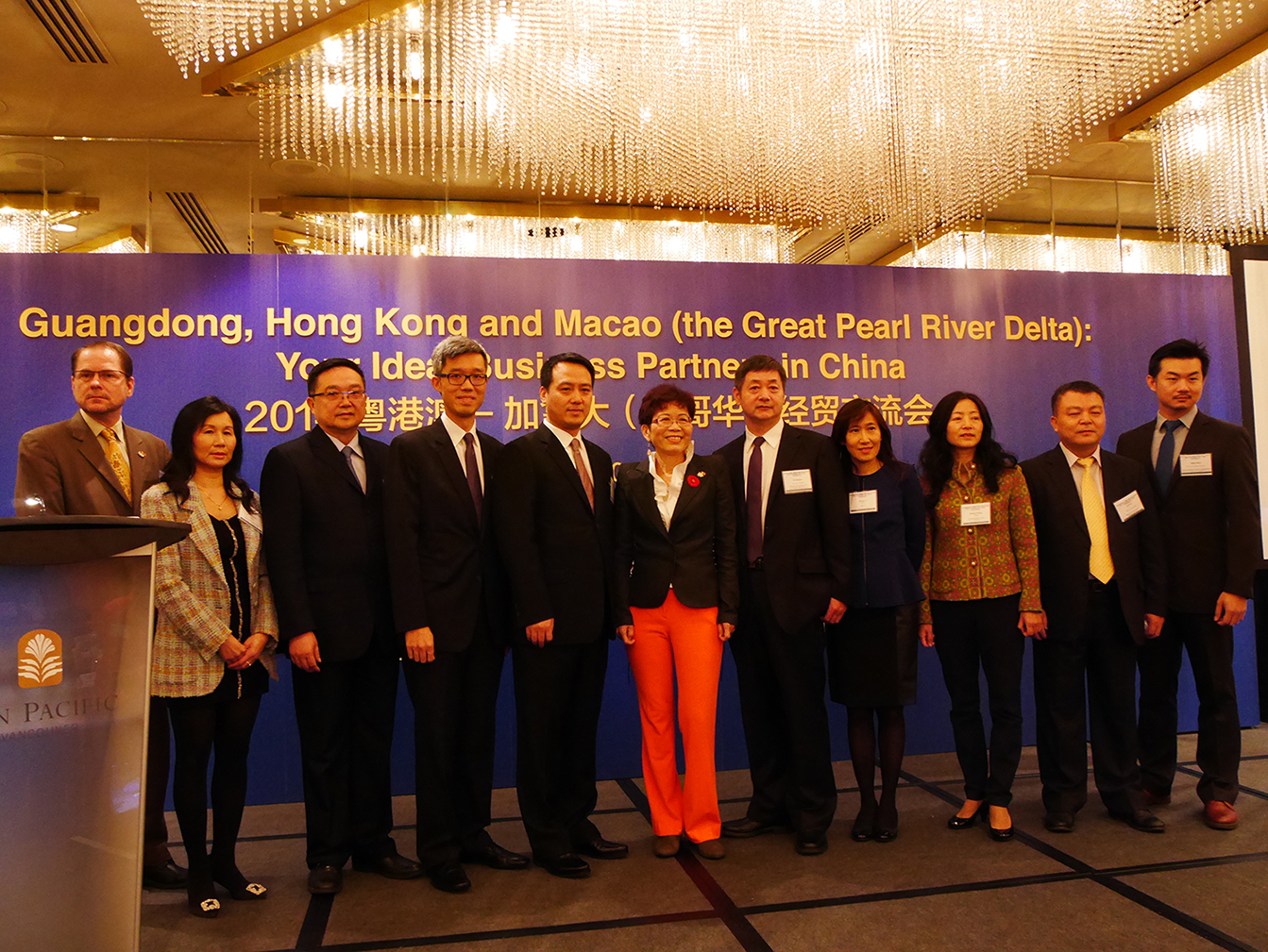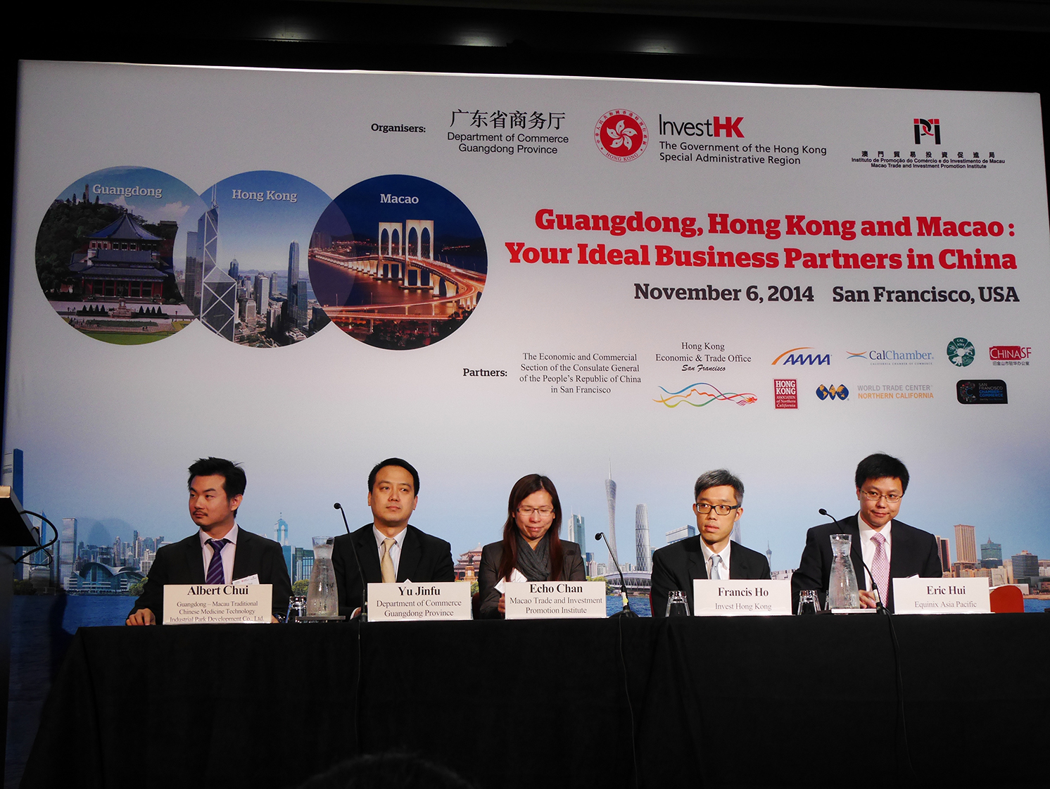 Intervieram como palestrantes nos dois seminários de promoção, entre outros, o Conselheiro Económico e Comercial do Consulado-Geral da República Popular da China em Vancouver, Yu Shanjun, o Conselheiro Económico e Comercial do Consulado-Geral da República Popular da China em San Francisco, Xia Xiang, o Director dos Serviços do Comércio Justo e cumulativamente Chefe da Divisão de Promoção do Comércio da Província de Guangdong, Yu Jinfu, o Director Associado de Invest Hong Kong, Francis Ho, o “Minister of International Trade” da Província de British Columbia, Teresa Wat, a Directora do “Hong Kong Economic and Trade Office in Toronto”, Gloria Lo, e a Directora do “Hong Kong Economic and Trade Office in San Francisco, Subrina Chow Shun Yee.