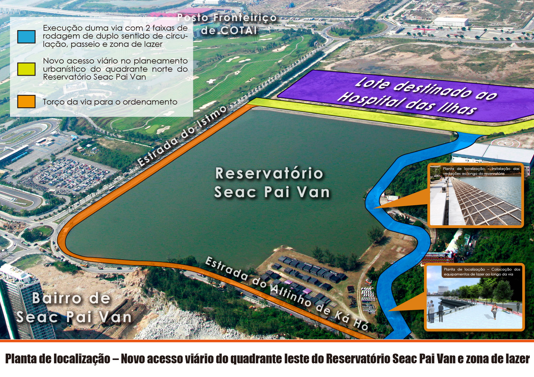Nesta óptica, a DSSOPT está procurar em breve concluir a elaboração dos projectos de concepção do novo acesso viário e da zona de lazer, será lançado o concurso público e iniciado a obra no 1.º semestre do próximo ano, e segundo as estimativas a obra poderá ter conclusão e entrada em funcionamento em 2016. Por outro lado, a Administração irá construir uma passagem superior para peões da Rotunda de Seac Pai Van, com vista a facilitar a deslocação dos moradores, os mesmos poderão naquela altura, através da passagem superior, chegar convenientemente ao Hospital das Ilhas ou a zona de lazer.