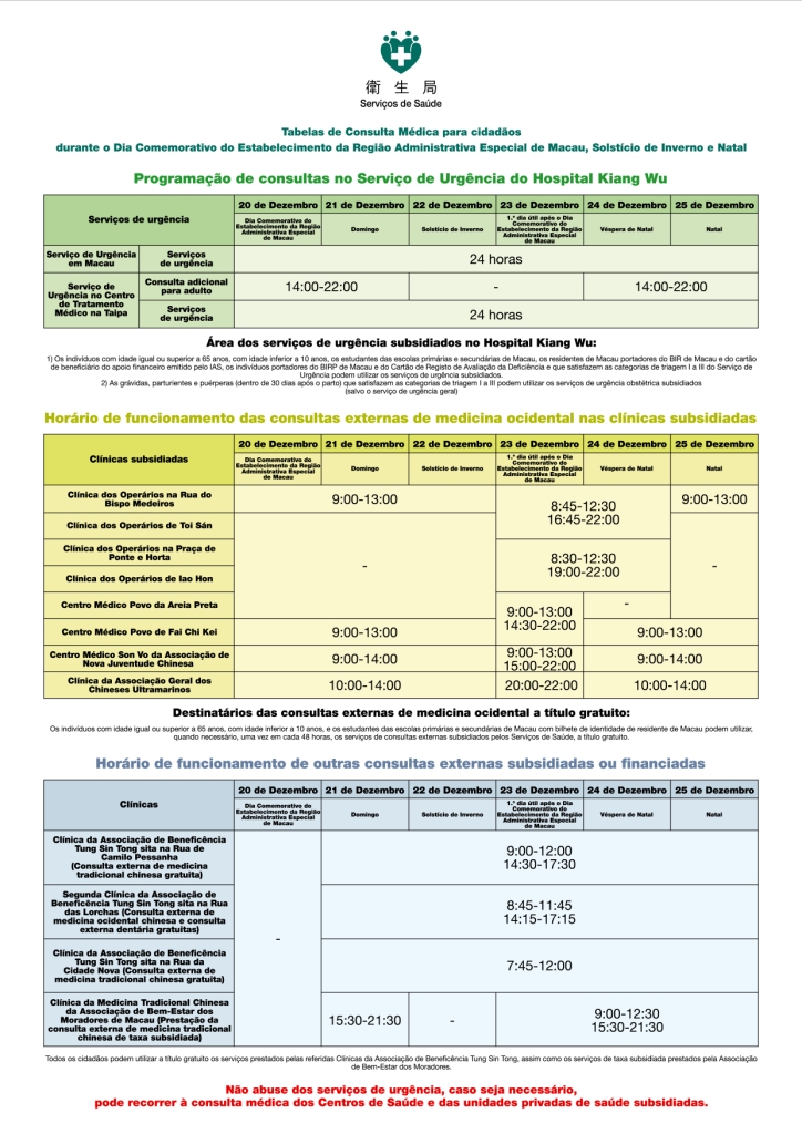 Tendo em conta que o dia 20 de Dezembro (Dia Comemorativo do Estabelecimento da RAEM), o dia 22 de Dezembro (Solstício de Inverno), o dia 24 de Dezembro (Véspera de Natal) e o dia 25 de Dezembro (Natal) são feriados e o dia 23 de Dezembro é dia de tolerância de ponto para os trabalhadores da administração pública, os Serviços de Saúde asseguram, da seguinte forma, a prestação de assistência médica durante este período: