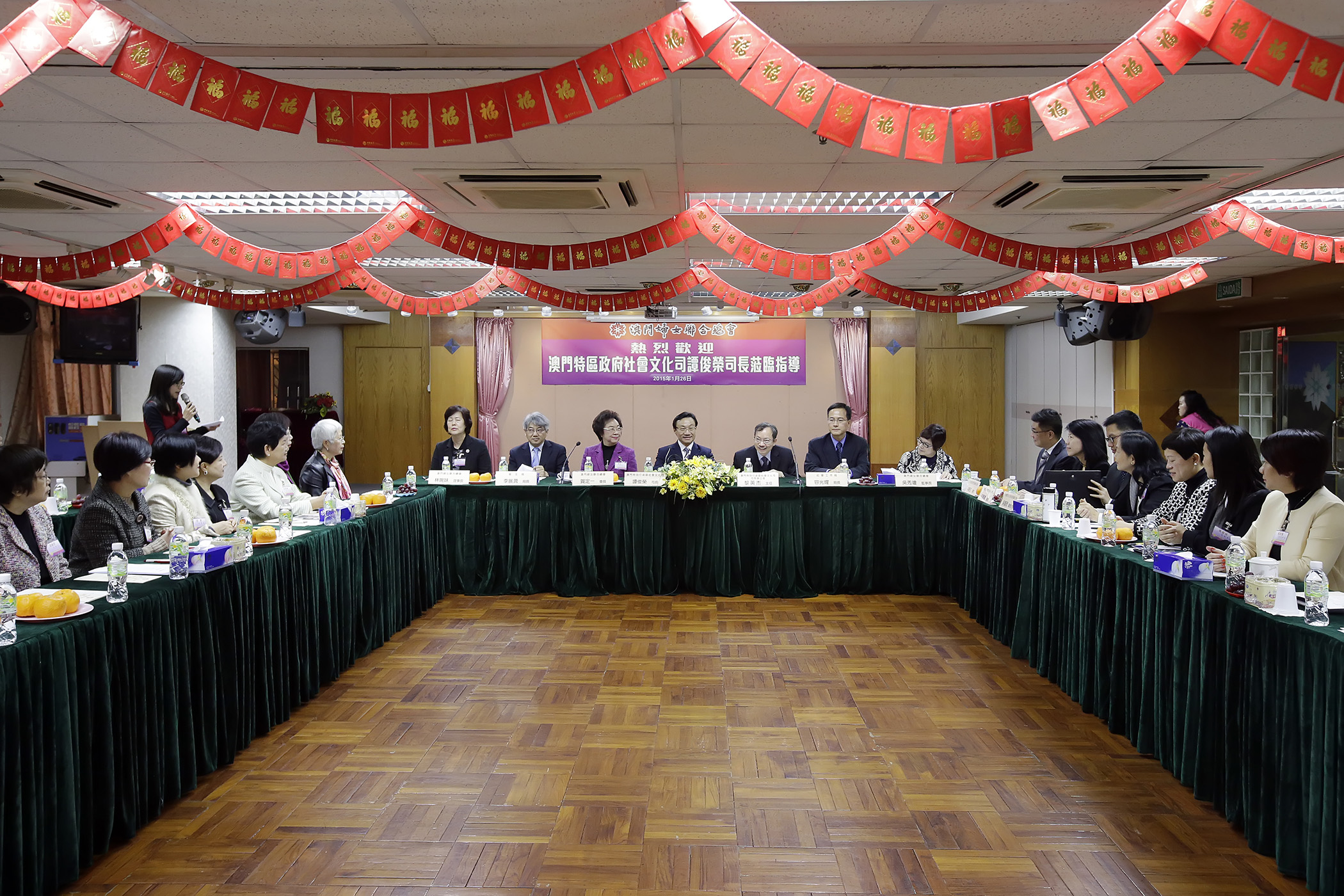 Os representantes do Governo foram recebidos pela presidente da Associação, Ho Teng Iat, a presidente da Direcção, Lam Un Mui, a presidente do Conselho Fiscal, Ng Sau King, e por mais de trinta membros da direcção.
