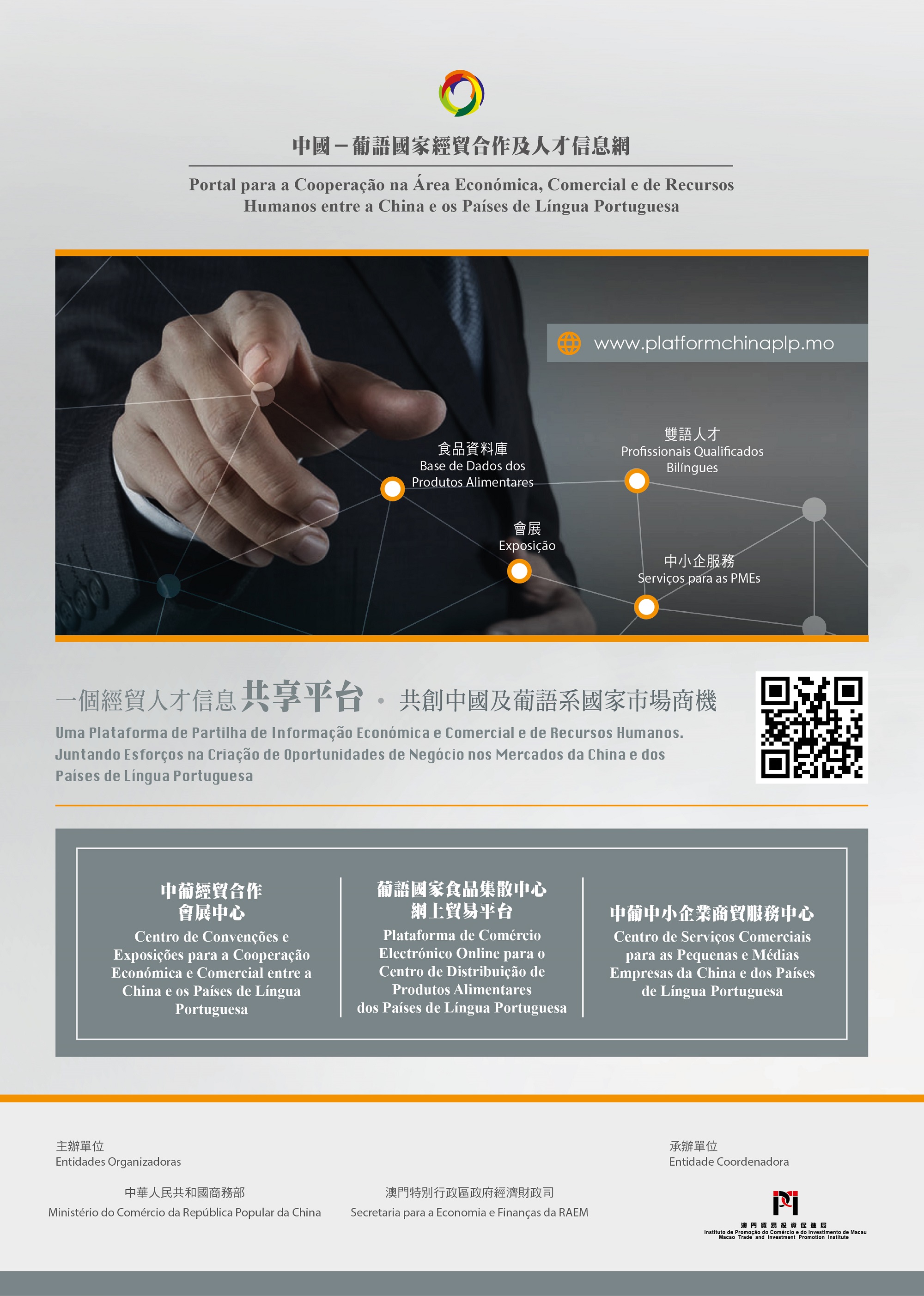 No seguimento do posicionamento de Macau como “Uma Plataforma” (Plataforma de Serviços para a Cooperação Económica e Comercial entre a China e os Países de Língua Portuguesa), estabelecido em destaque no 12º Plano Quinquenal do Estado, e em articulação com as novas medidas anunciadas pelo Governo Central em 2013 no sentido de reforçar o desempenho das funções de Macau como plataforma de cooperação económica em apoio ao desenvolvimento dos Países de Língua Portuguesa, tendo em conta as necessidades do desenvolvimento do mercado e das operações concretas do sector empresarial, foi inaugurado formalmente, no dia 1 de Abril de 2015, o “Portal para a Cooperação na Área Económica, Comercial e de Recursos Humanos entre a China e os Países de Língua Portuguesa” (adiante designado por “Portal de Informação”, site: www.platformchinaplp.mo), que consiste na Base de Dados de Quadros e Serviços Profissionais Bilingues (Chinês-Português), Base de Dados dos Produtos Alimentares dos Países de Língua Portuguesa, Informação Actualizada sobre Convenções e Exposições da China e dos Países de Língua Portuguesa, Informação Económica e Comercial e Respectivas Leis e Regulamentos dos Países de Língua Portuguesa, entre outros. O novo “Portal de Informação”, coordenando com os “Três Centros” no âmbito da cooperação económica e comercial entre a China e os Países de Língua Portuguesa, designadamente “Centro de Distribuição dos Produtos Alimentares dos Países de Língua Portuguesa”, “Centro de Convenções e Exposições para a Cooperação Económica e Comercial entre a China e os Países de Língua Portuguesa” e “Centro de Serviços Comerciais para as Pequenas e Médias Empresas da China e dos Países de Língua Portuguesa”, visa maximizar a função de sinergia dos serviços on-line e off-line em paralelo, reforçar as ligações mútuas e ajudar as empresas na exploração de oportunidades de negócios.