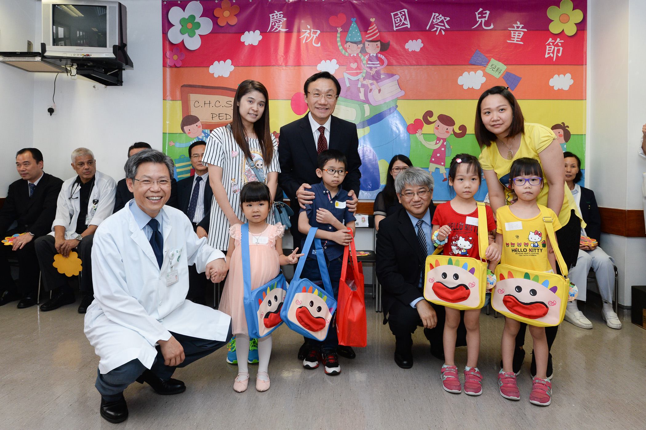 Depois, com o apoio da Associação dos Voluntários Jovens de Macau e dos trabalhadores do Centro Hospitalar Conde de S. Januário, realizou-se uma festa para as crianças internadas e aquelas com internamento a longo prazo no Hospital de Dia, durante a qual, os voluntários conduziam-nas nos jogos interactivos de canções e danças animadas, e na passagem alegre e vivida do Dia Mundial da Criança, bem como no manifestar do apreço do carinho e apoio do Governo da RAEM e dos diversos sectores sociais.