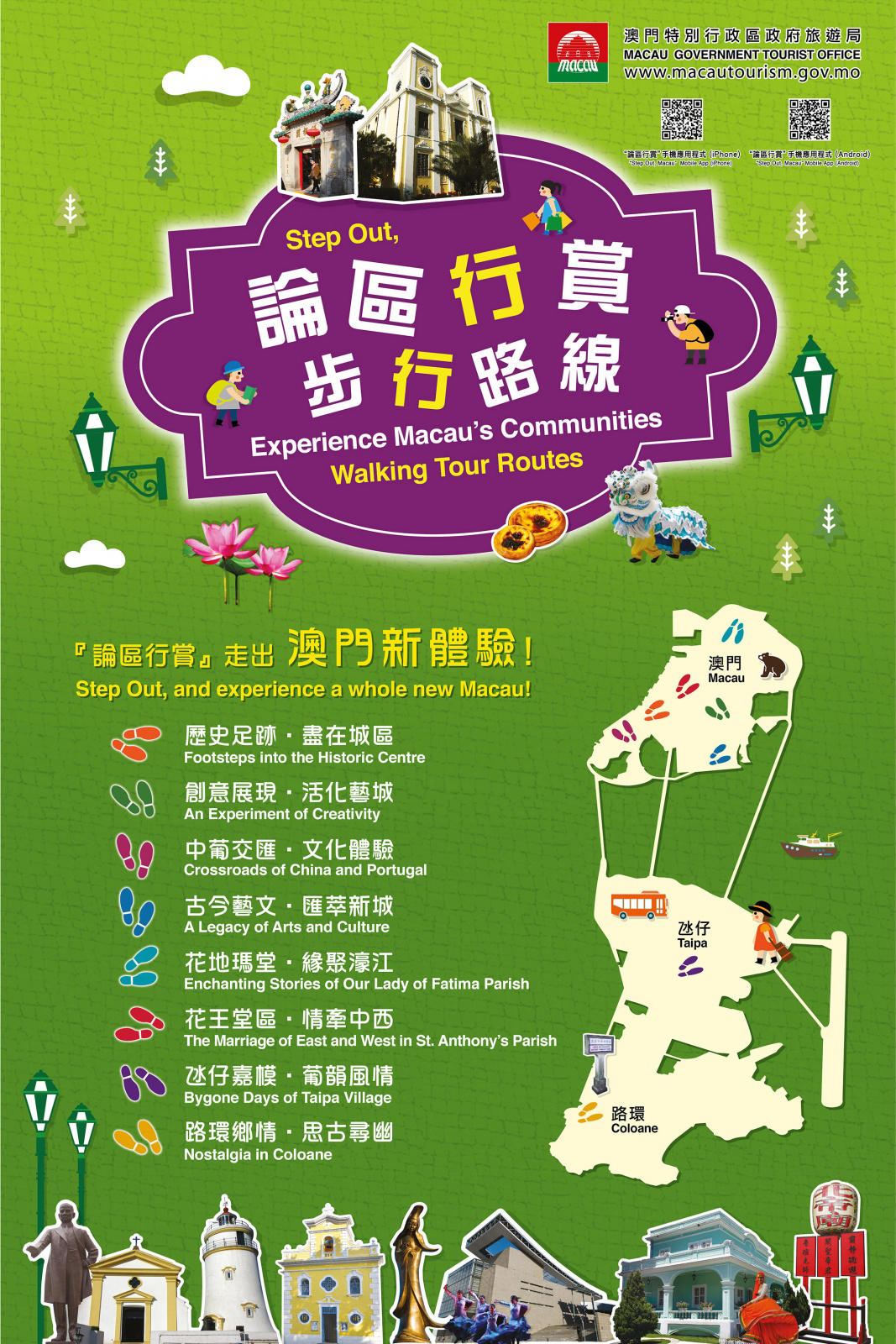 Os residentes e visitantes podem fazer o descarregamento gratuito da aplicação para telemóveis inteligentes sobre os roteiros “Step Out, Macau” na App Store e Google Play. Para mais informações, consultar a página electrónica da DST em http://www.macautourism.gov.mo ou ligar para a Linha Aberta para o Turismo (853) 2833 3000.