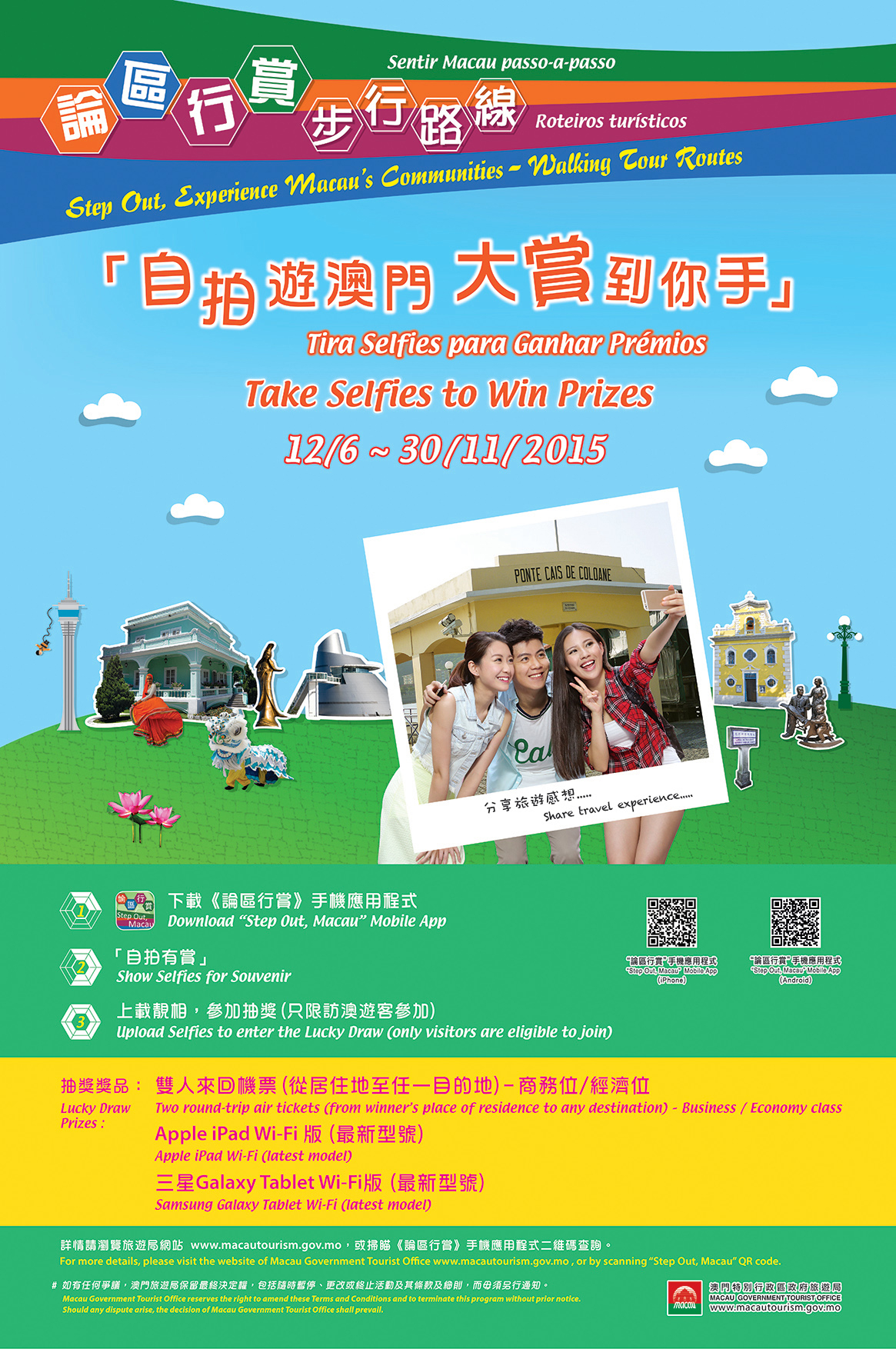 Por outro lado, os visitantes podem ainda aceder à aplicação “Step Out, Macau”, fazer o carregamento das suas “selfies” e escrever a sua experiência em Macau, para ficarem habilitados a sorteios de prémios, que incluem bilhetes de avião de ida e volta em classe executiva para duas pessoas (do local de residência para outro destino), tabletes, entre outros. (Apenas visitantes a Macau podem participar no sorteio.)