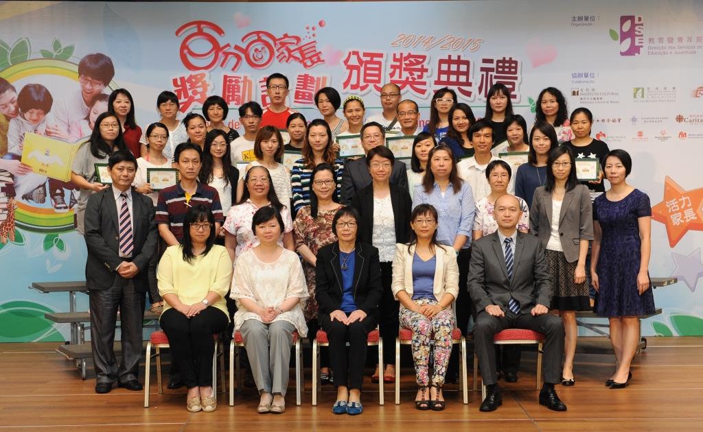 Foram premiadas um total de 601 pessoas pela sua participação no “Plano de incentivo 100% pais” do ano lectivo de 2014/2015. 20 delas obtiveram o prémio de maior honra designado “100% pais” e receberam, da subdirectora Kuok Sio Lai, certificados de louvor e cupões de viagens. As 357 pessoas que receberam o prémio “encarregados de educação activos”, as 335 que ganharam o prémio “encarregados de educação positivos” e as 121 que obtiveram o prémio “encarregados de educação voluntários” foram representadas pelas respectivas escolas que receberam os seus certificados de louvor e cupões de livros, e ficaram encarregues de os entregar aos respectivos premiados.