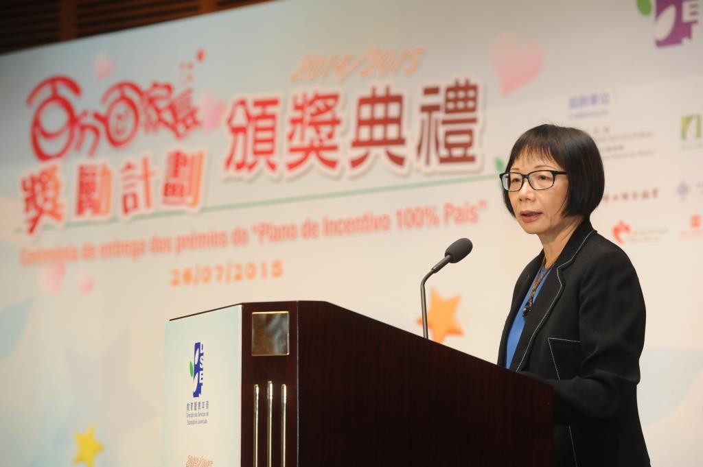 Para distinguir os pais que participaram activamente nas referidas actividades, a DSEJ organizou no dia 26 de Julho, pelas 10:30 horas, no Centro de Convenções do Centro de Ciência de Macau, a cerimónia de entrega de prémios do “Plano de incentivo 100% pais” do ano lectivo de 2014/2015. Marcaram presença no evento, a subdirectora da DSEJ, Kuok Sio Lai, a chefe da Divisão de Formação e Informação Cívicas do IACM, Lam Mei Sio, a gestora do Museu das Comunicações da DSC, Wong On I, bem como mais de 30 representantes de instituições educativas e associações.