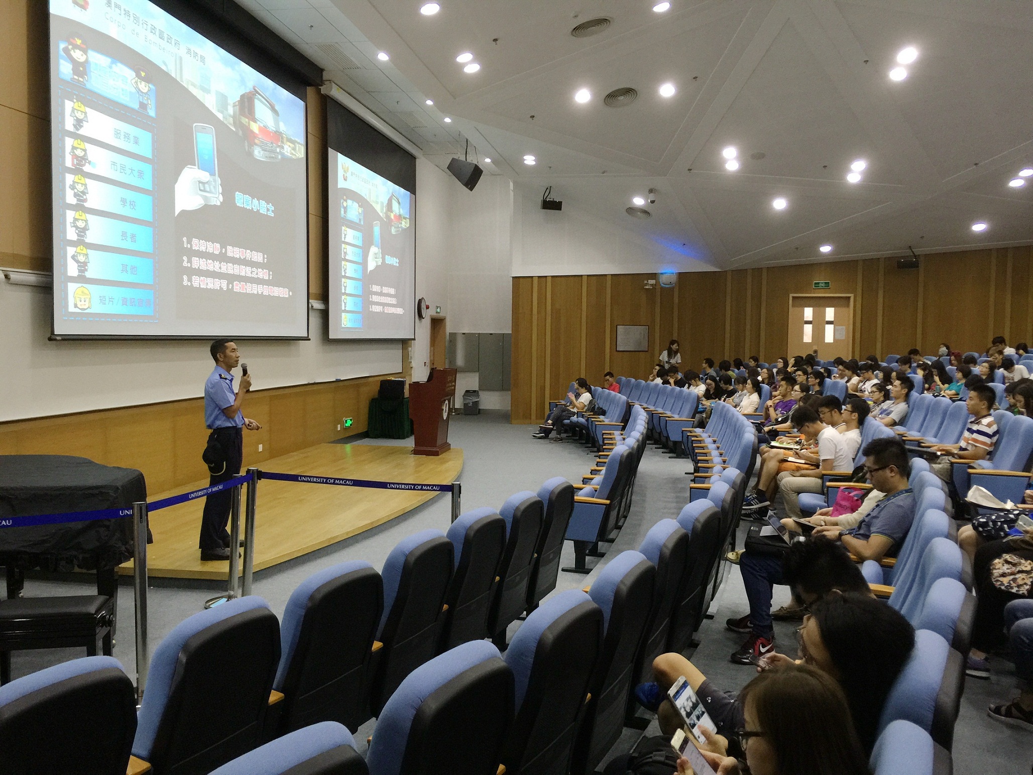 O Corpo de Bombeiros (CB) tem prestado maior atenção à segurança contra incêndios no novo campus da Universidade de Macau (UM). A fim de reforçar a consciência de prevenção, a capacidade de resposta e as técnicas de evacuação dos alunos, docentes e funcionários alojados no campus universitário, realizámos, em colaboração com a UM, uma palestra de conhecimentos sobre a segurança contra incêndios no começo do novo ano lectivo. A palestra que se divide em quatro sessões contou com um total de cerca de 600 participantes.