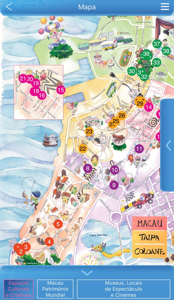 Para além da informação sobre as entidades culturais e criativas de Macau, a versão mais recente da aplicação móvel do “Mapa CCM” disponibiliza detalhes sobre “Macau Património Mundial”, bem como “Museus, Locais de Espectáculo e Cinemas”. Os utilizadores podem consultar informações, imagens e as localizações destas entidades ou locais de interesse. A secção sobre “Itinerários Turísticos” na nova versão divide-se em duas partes: “Passeio à Freguesia” e “Itinerários Turísticos, Culturais e Criativos”. Estes itinerários constituem referências de viagem, articulando informações sobre uma variedade de espaços culturais e criativos e sítios do Património Mundial e orientando os utilizadores nos seus passeios pela cidade, de modo a conhecerem melhor a sua arte e cultura.
