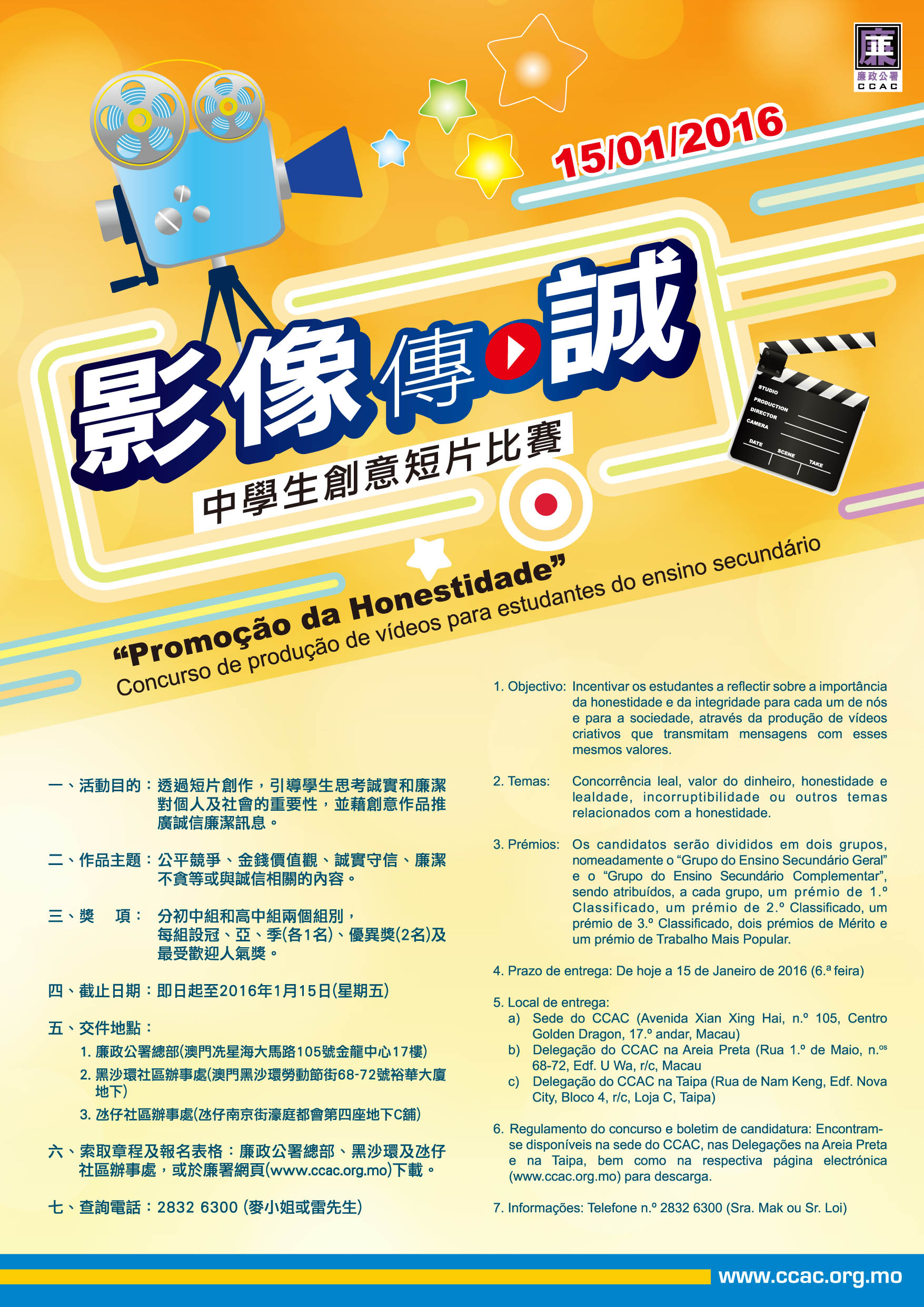 Após ouvidas as opiniões manifestadas por algumas escolas e docentes no sentido de se alargar o prazo de entrega de trabalhos relacionados com o “Concurso de produção de vídeos para estudantes do ensino secundário – Promoção da Honestidade”, organizado pelo CCAC, por forma a que os alunos tenham mais tempo extra-curricular para filmagem e produção dos respectivos vídeos, o CCAC resolveu alargar o referido prazo, cujo término estava inicialmente previsto para o dia 30 do corrente mês, para o dia 15 de Janeiro do próximo ano. O CCAC espera que os alunos possam transmitam mensagens de honestidade e integridade através da produção de vídeos criativos. A lista dos premiados será publicada na página electrónica do CCAC em Março de 2016, sendo que os detalhes da distribuição dos prémios serão especificamente notificados.