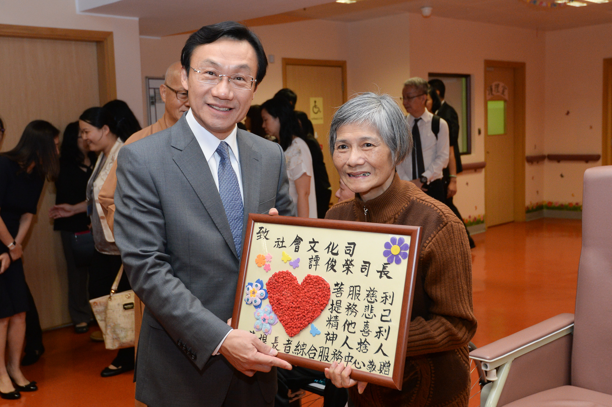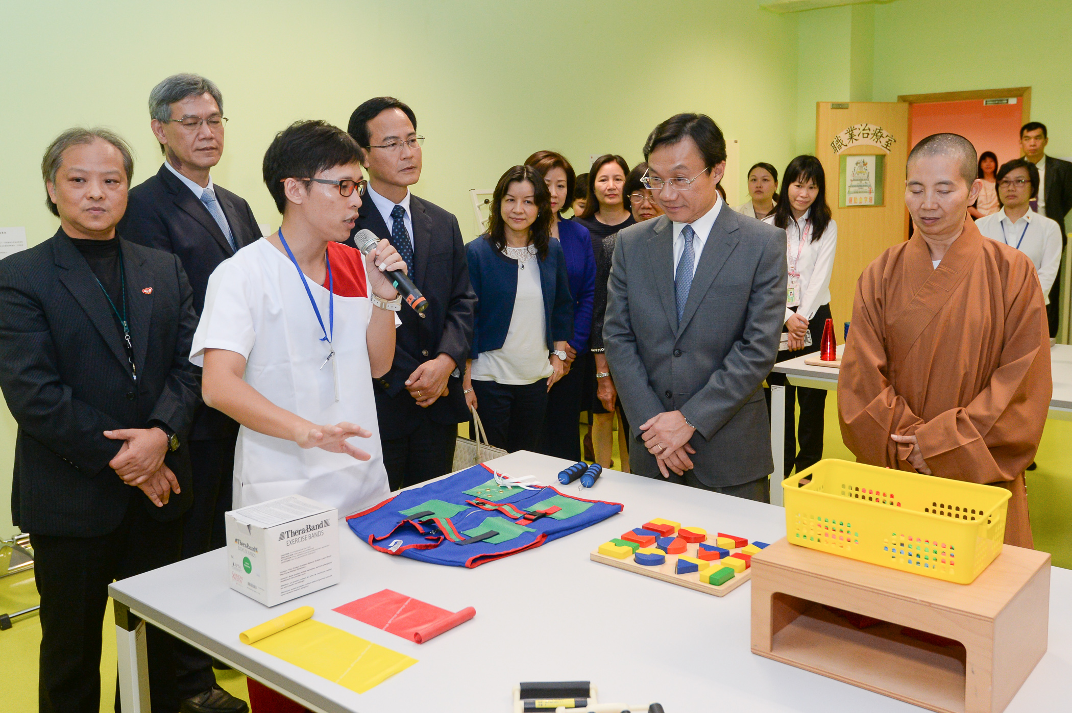 Em seguida, o Secretário e a sua comitiva deslocaram-se ao 8.° piso do Edifício para visitar o Complexo de Serviços para Jovens e Famílias Pou Tai, que actua na área do desenvolvimento da juventude, prevenção, assistência e aconselhamento, prestando portanto serviços que incluem actividades para o desenvolvimento da juventude, serviços de aconselhamento e de apoio aos jovens, educação para vida familiar e actividades para pais e filhos, serviços de aconselhamento e de apoio à família, serviços de apoio a escolas e actividades comunitárias de solidariedade. O referido Complexo disponibiliza serviços diversificados, adoptando o modelo de “one stop”, no sentido de não só ir ao encontro das necessidades dos jovens e das suas famílias, como também, estimular os jovens de modo a que estes prestem mais atenção à sociedade, participem nos assuntos sociais e desenvolvam o espírito de solidariedade e amor, em prol da promoção da harmonia na família e na sociedade. Durante a vista, houve crianças que ofereceram prendas ao Secretário com quem tiraram fotografias.