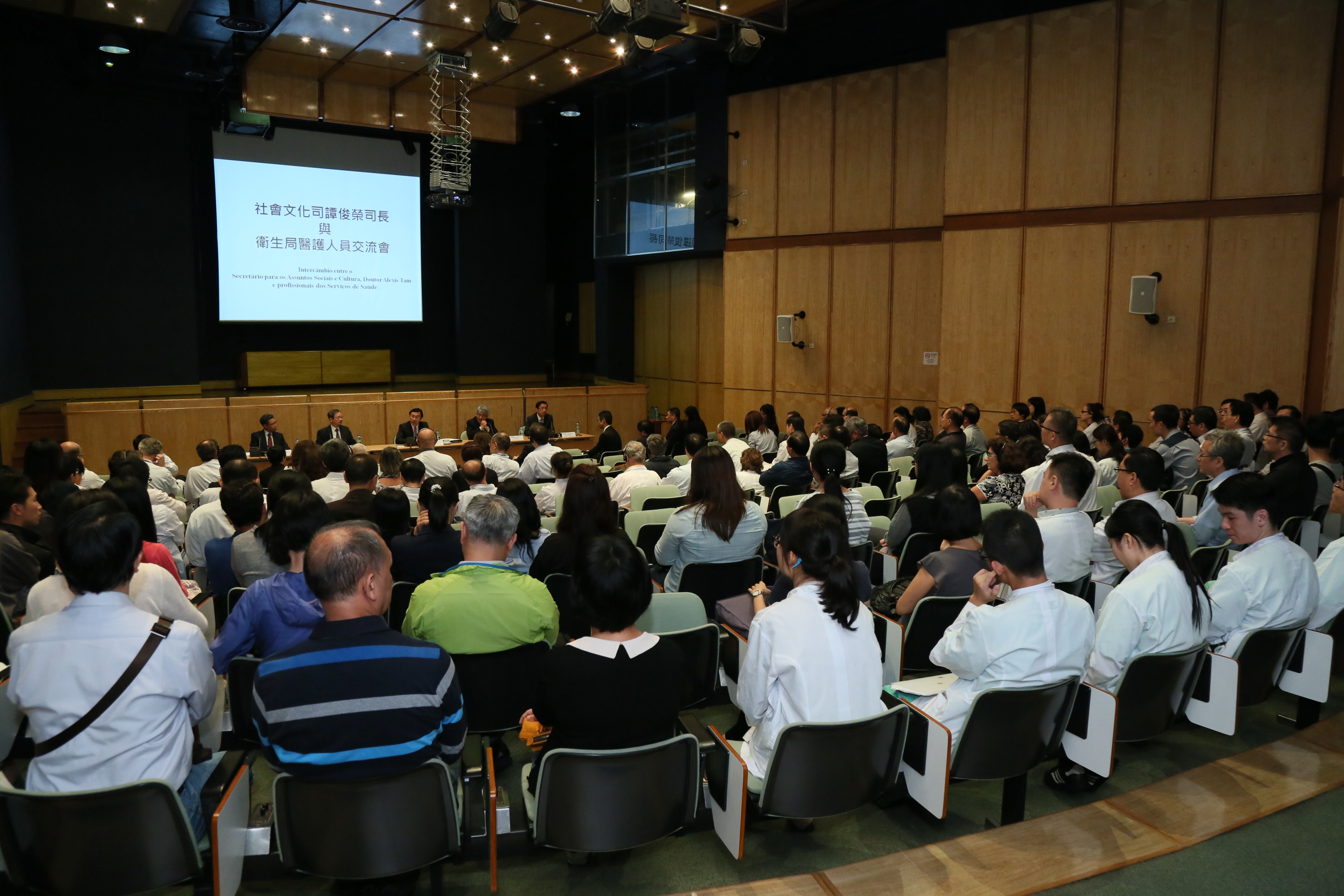 O Secretário dos Assuntos Sociais e Cultura, Dr. Alexis Tam acompanhado do Chefe do Gabinete do Secretário para os Assuntos Sociais e Cultura, Dr. Lai Ieng Kit, do Director dos Serviços de Saúde, Dr. Lei Chin Ion e dos Subdirectores, Dr. Kuok Cheong U, Dr. Cheang Seng Ip realizou quinta-feira (12 de Novembro), duas sessões de intercâmbio com cerca de 400 médicos e enfermeiros.