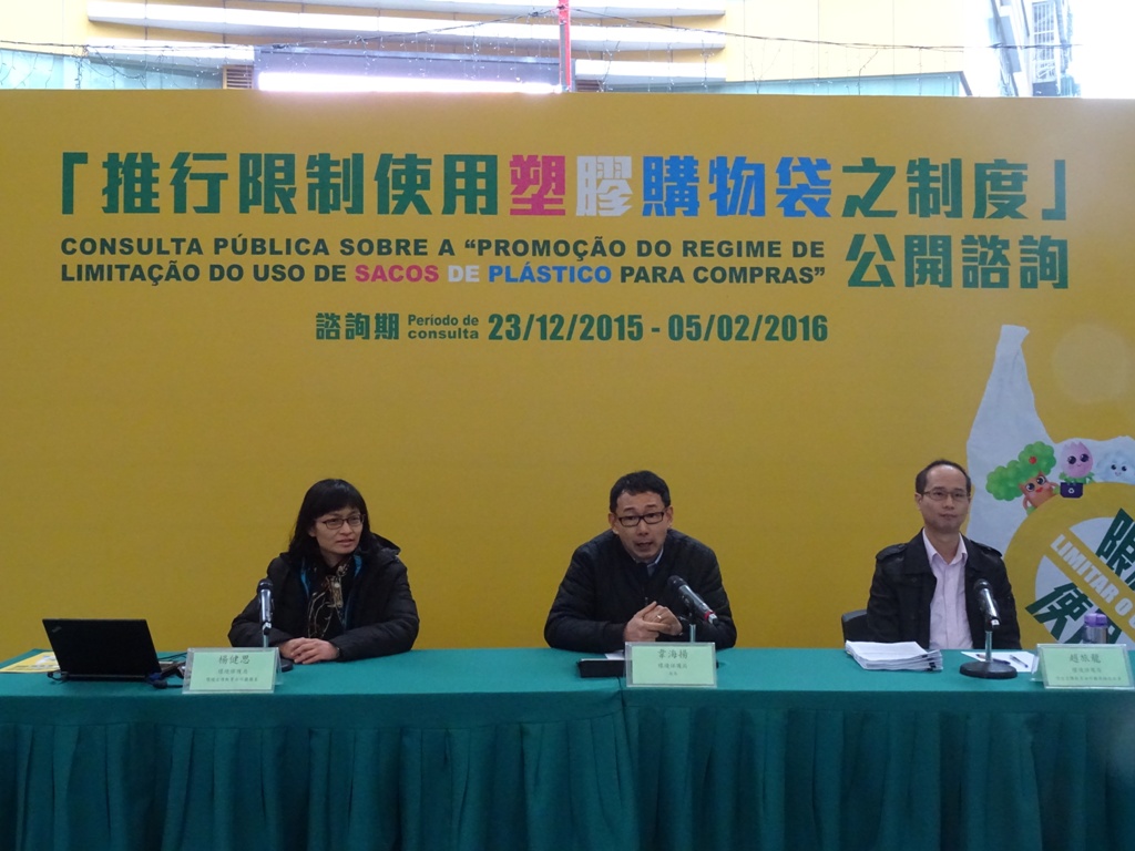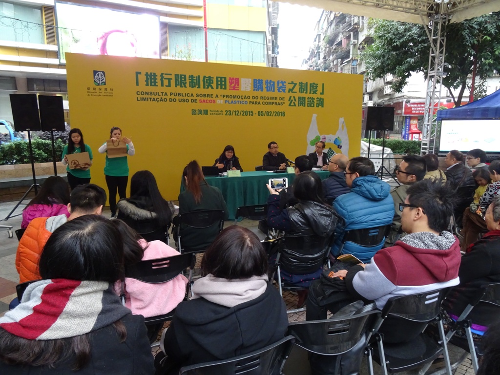 A Direcção dos Serviços de Protecção Ambiental (DSPA) organizou uma consulta pública, com a duração de 45 dias e com início em 23 de Dezembro de 2015, sobre a “Promoção do regime de limitação do uso de sacos de plástico para compras”, tendo sido, também, organizada para hoje (16 de Janeiro de 2016) uma sessão de consulta pública, pelas 15:00, na Zona de Lazer da Rotunda de Carlos da Maia, com o objectivo de recolher as opiniões e sugestões dos cidadãos, as quais contribuirão para uma maior eficácia e operacionalidade das medidas a serem lançadas, em conformidade com a realidade de Macau.