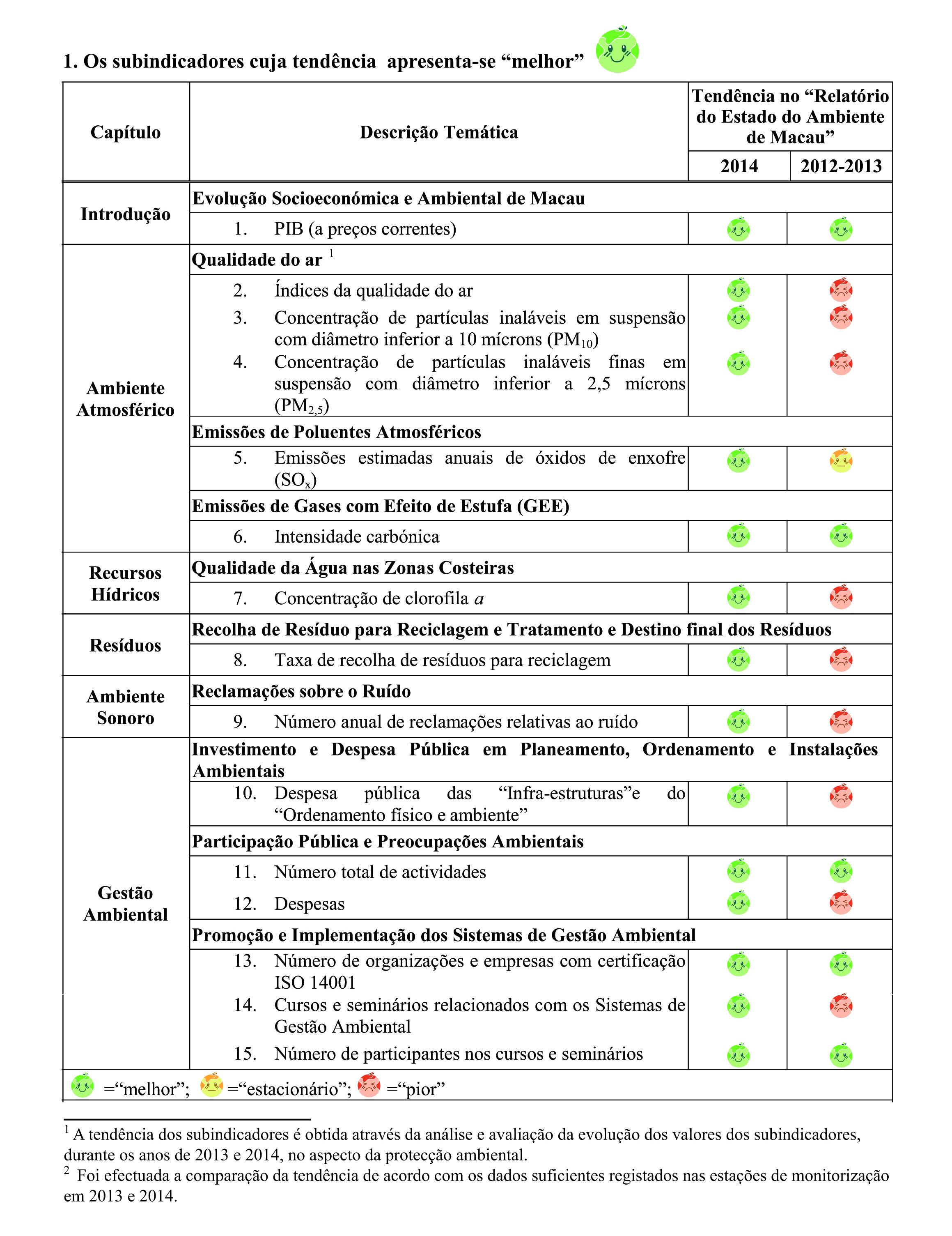No contexto geral, em comparação com o ano de 2013, diminuiu em 2014 o número de subindicadores que registaram uma tendência “melhor” e “pior”, respectivamente, em 6 e 12, enquanto que os subindicadores que registaram uma tendência “estacionário” aumentaram em número de 12. A evolução da maioria dos subindicadores apresenta-se suave. No entanto, o número de subindicadores que registaram uma tendência “pior” ainda ocupa uma percentagem maior que os restantes, nomeadamente a qualidade das águas costeiras de Macau piorou e o volume dos resíduos transportados para tratamento na CIRS aumentou significativamente.