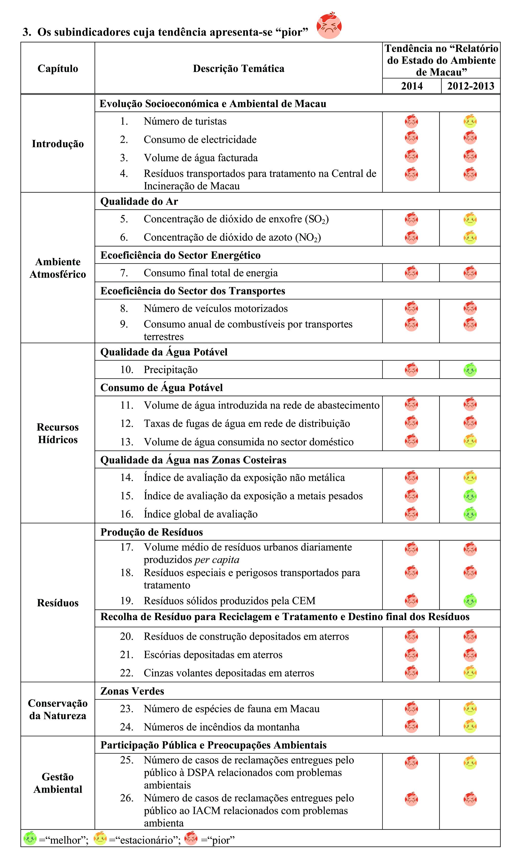 Dentro dos 19 principais indicadores ambientais, divididos num total de 82 subindicadores, analisados no presente Relatório, 15 subindicadores (cerca de 18,3%) apresentam uma tendência de evolução “melhor”, incluindo os de Índice da qualidade do ar, da Intensidade carbónica e Número de participantes nos cursos e seminários sobre os sistemas de gestão ambiental; 38 subindicadores (cerca de 46,3%) apresentam uma tendência de evolução “estacionário”, incluindo os de Emissões estimadas de gases com efeito de estufa (GEE), Intensidade turística, Emissões estimadas das diversas fontes de poluentes atmosféricos, Taxa de área urbana arborizada e Níveis de ruído; 26 subindicadores (cerca de 31,7%) apresentam uma tendência de evolução “pior”, incluindo os de Consumo de electricidade, Consumo de água facturada, Volume de resíduos transportados para serem tratados na Central de Incineração de Resíduos Sólidos de Macau e Índice geral de qualidade das águas das zonas costeiras.