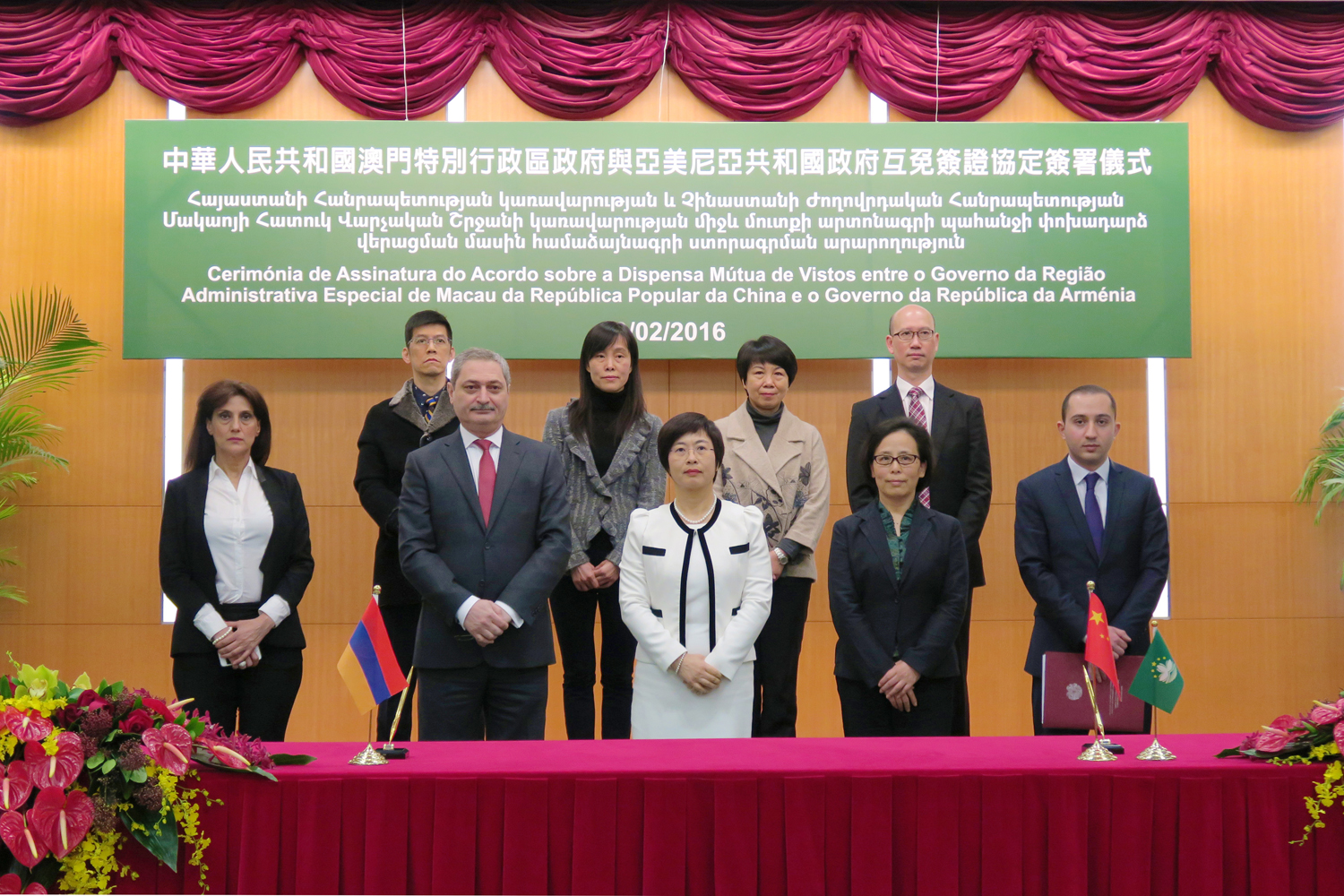 Realizou-se no dia 3 de Fevereiro de 2016, na Sede do Governo da RAEM, a cerimónia da assinatura do “Acordo de Dispensa Mútua de Visto” entre o Governo da Região Administrativa Especial de Macau da República Popular da China e o Governo da República da Arménia.