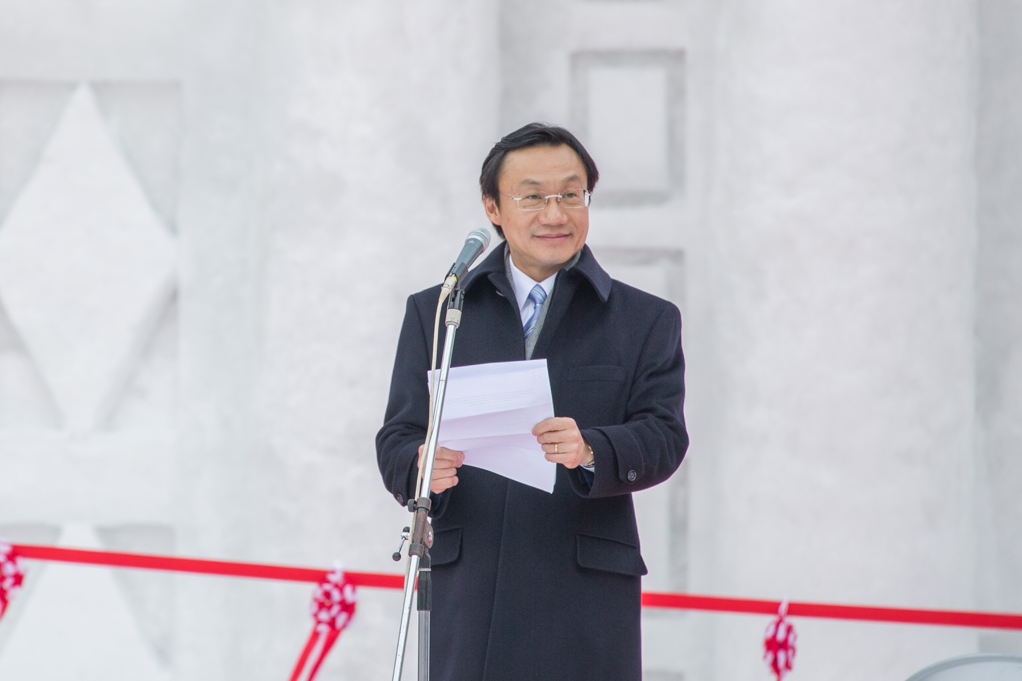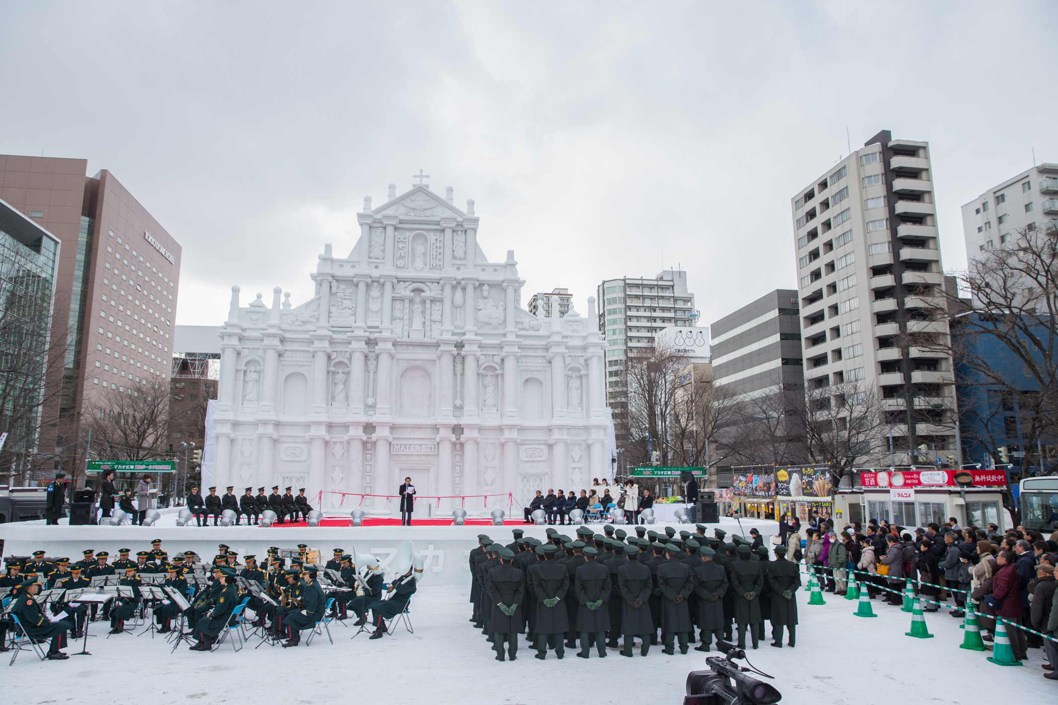 O Governador de Sapporo, Katsuhiro Akimoto, a par com o presidente do Comité Executivo do Festival de Neve de Sapporo, Hisao Hoshino, o Presidente da HBC, Takashi Watanabe, o Comandante do Grupo de Sinal do Exército do Norte, do Grupo Terrestre de Auto-defesa do Japão, Kazuhiro Oka, o Chefe do Gabinete do Secretário para os Assuntos Sociais e Cultura, Ip Peng Kin, a Directora da DST, Maria Helena de Senna Fernandes, o Assessor do Gabinete do Secretário para os Assuntos Sociais e Cultura, Charles Lam, a Chefe do Departamento de Promoção Turística da DST, Betty Fok, entre outros, participaram na cerimónia de entrega da escultura de neve das Ruínas de S. Paulo.