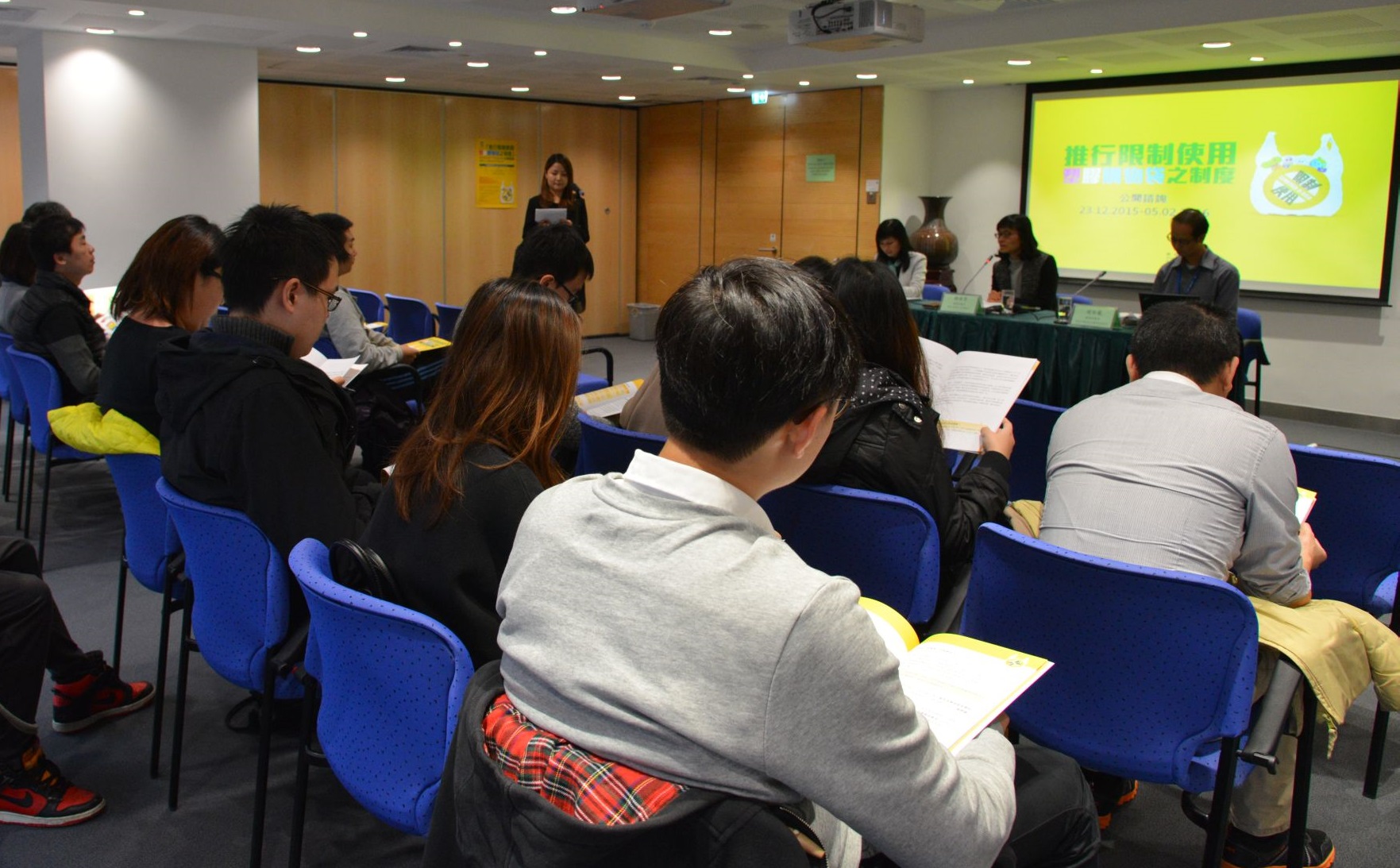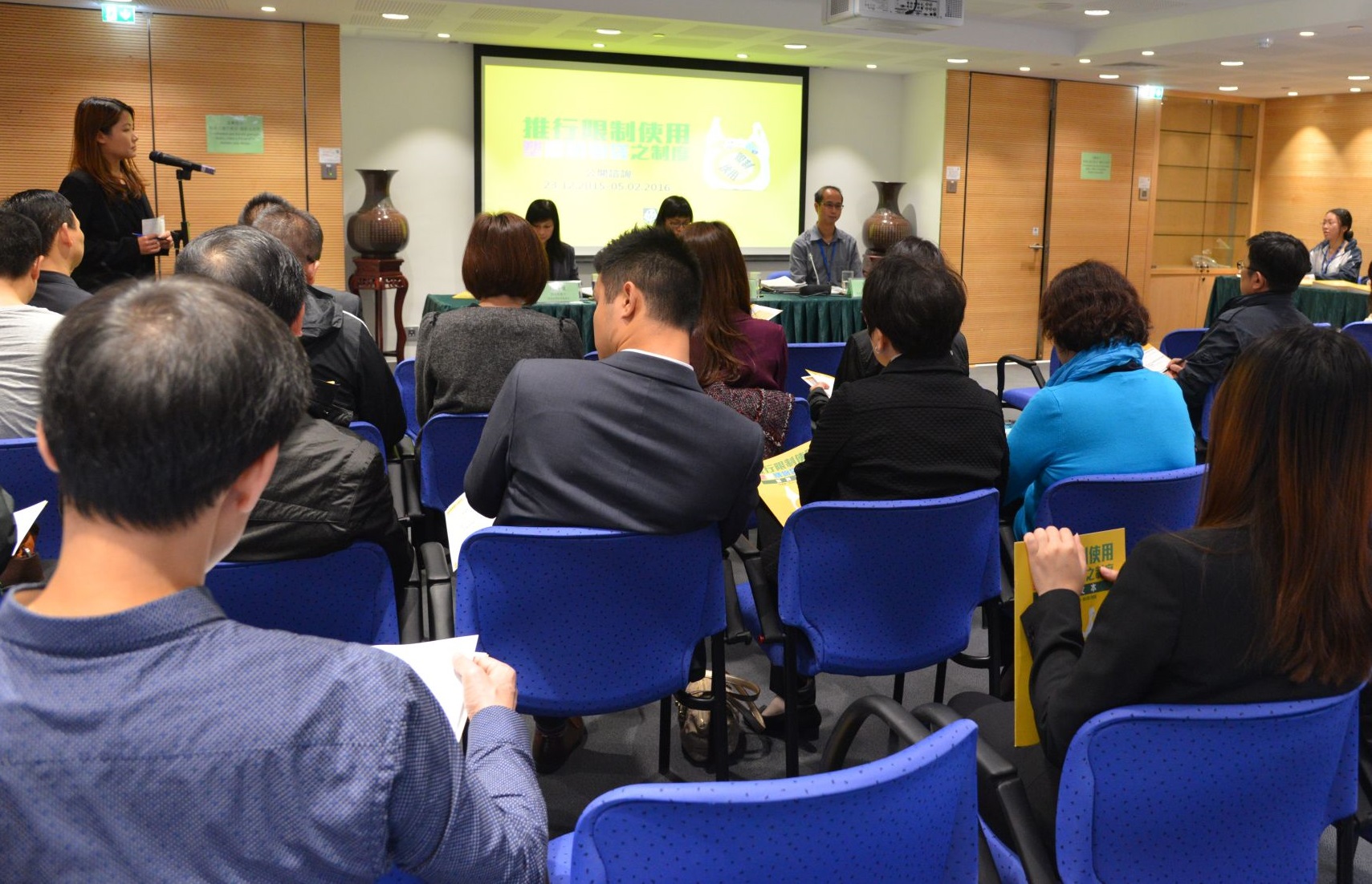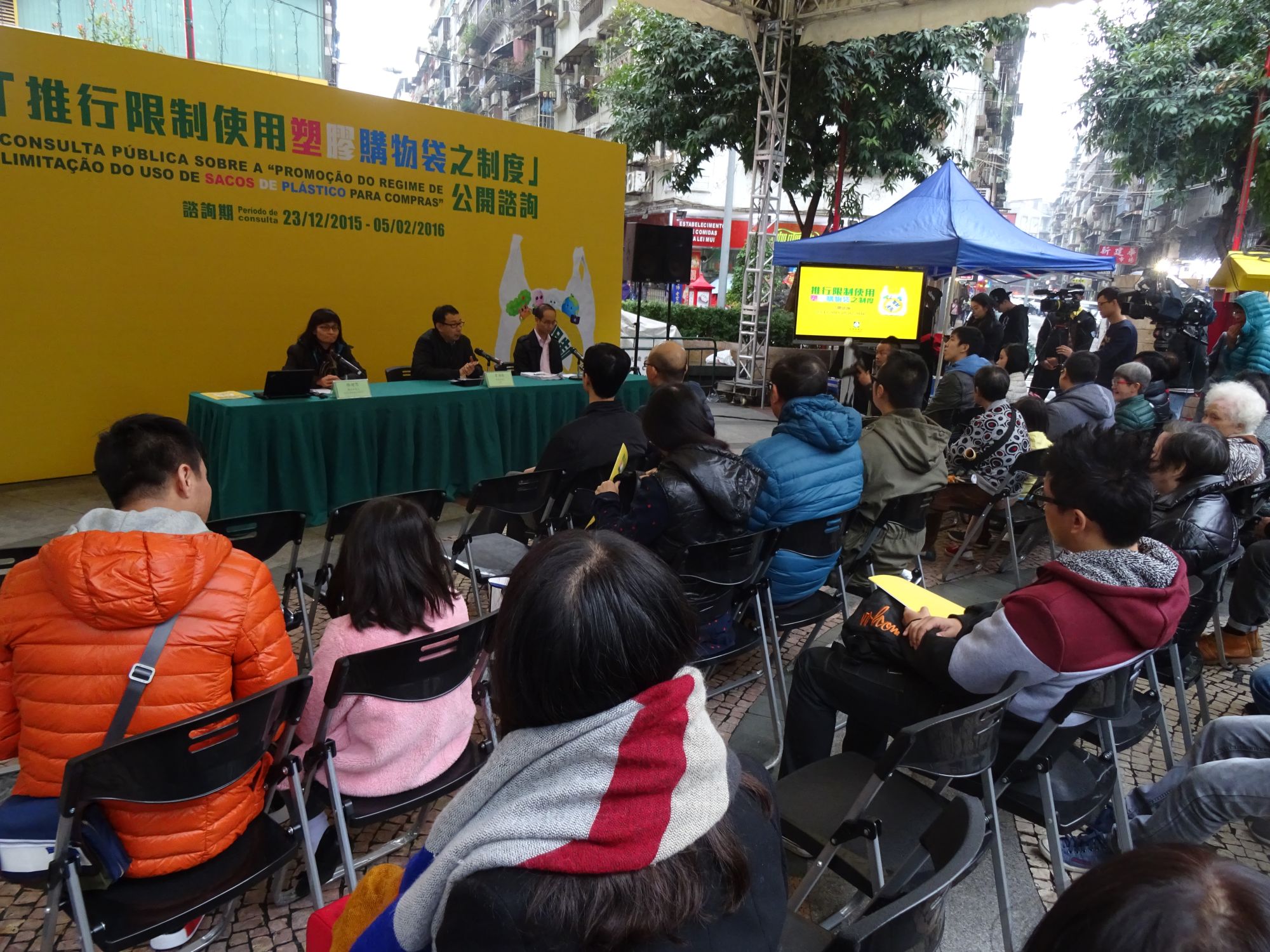 Entre o dia 23 de Dezembro de 2015 e 5 de Fevereiro de 2016, a DSPA promove a presente consulta pública sobre a “Promoção do regime de limitação do uso de sacos de plástico para compras”. Através de conferência de imprensa, das sessões de consulta pública e das sessões de consulta pública exclusivas para o sector, associações sociais, Conselho Consultivo de Serviços Comunitários e serviços públicos, a DSPA visa recolher as opiniões e sugestões dos diversos sectores da sociedade sobre a cobrança de “taxas de saco de plástico” aquando das compras a retalho, tipos de estabelecimentos comerciais regulados, nível de cobrança e isenções, entre outros.