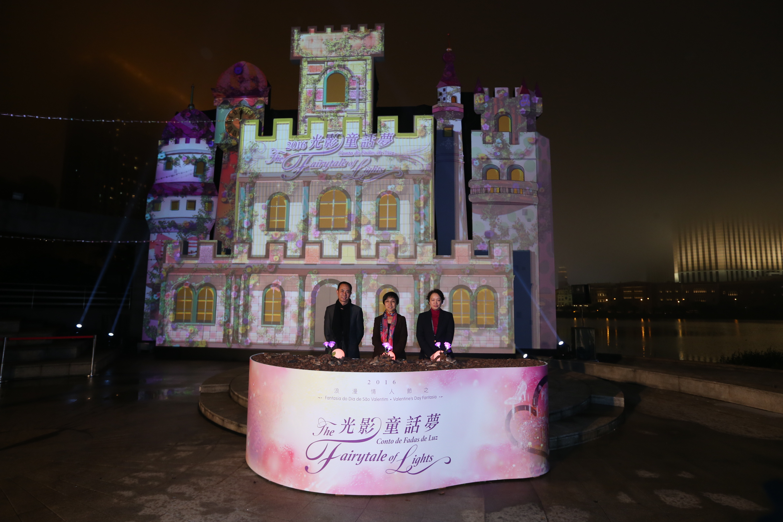 A directora da DST, Maria Helena de Senna Fernandes, o presidente do Instituto Cultural (IC), Ung Vai Meng, e a membro do Conselho de Administração do Instituto para os Assuntos Cívicos e Municipais (IACM), Isabel Celeste Jorge, presidiram à cerimónia de abertura da exibição de vídeo mapping do espectáculo de luzes “Fantasia do Dia de São Valentim 2016 - Conto de Fadas de Luz”. Num ambiente de fantasia, teve início a exibição de vídeo mapping “O sapato de cristal da Cinderella”, para levar os espectadores a viajarem no tempo, entrando num romântico sonho de infância.
