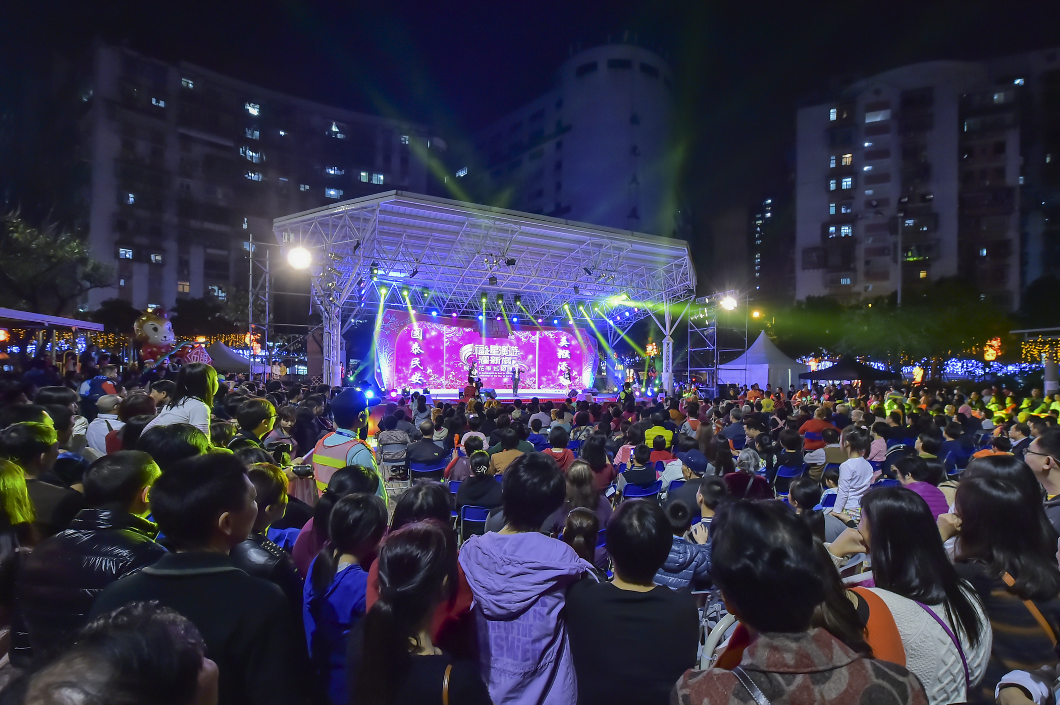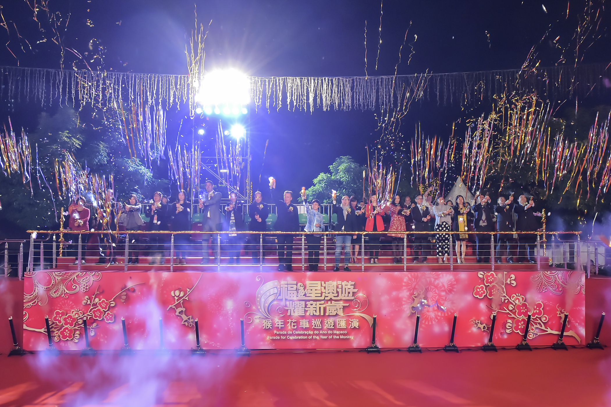 A "Parada de Celebração do Ano do Macaco" contou com o desfile de 14 carros alegóricos, que partiram da Rua Norte do Patane, passando pela Av. do Conselheiro Borja, Estrada do Arco, Estrada da Areia Preta, Av. de Venceslau de Morais, Rua Quatro do Bairro da Areia Preta, Av. da Longevidade, e Rua do Mercado de Iao Hon, até ao ponto de chegada no Jardim do Mercado de Iao Hon. A DST distribuiu lembranças, como mascotes e chapéus de macaco, pulseiras luminosas, palmas de claques luminosas, nos pontos de início e fim da parada, que foram uma grande atracção para o público. A partir das 20h15 foram realizados espectáculos de variedades no palco. O espectáculo contou com a actuação dos cantores de Macau, Filipe Tou, Alan Tse, Ken Sou, Kevin Cheng, Viviana Lo, Elisa Chan, Ring Hun e Kayaku Sou, e encerrou com a actuação do famoso artista de Hong Kong, Vincent Wong, atraindo muitos residentes e visitantes, num ambiente muito animado. O evento terminou por volta das 21h30.