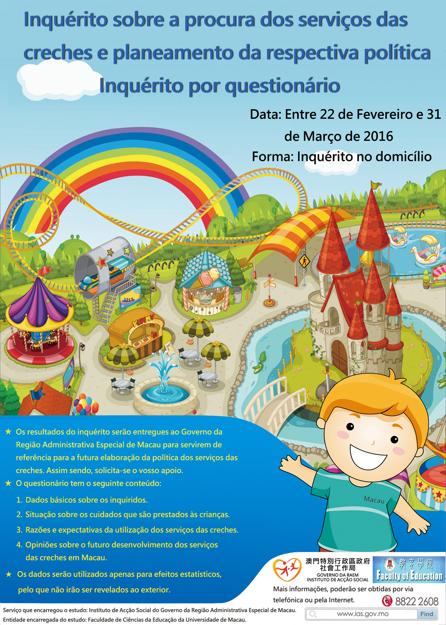 O Instituto de Acção Social (IAS) encomendou à Faculdade de Educação da Universidade de Macau o “Inquérito sobre a procura dos serviços das creches e estudo sobre o planeamento das respectivas políticas”. Neste contexto, no período compreendido entre 22 de Fevereiro e 31 de Março de 2016, ir-se-ão efectuar as visitas aos domicílios das famílias seleccionadas para a realização de um inquérito através de questionário, com vista à recolha de dados junto dos encarregados de educação dos bebés e crianças com idade igual ou superior a 6 anos. Os resultados do inquérito irão servir de referência para o Governo da RAEM na definição das políticas relativas aos serviços das creches.