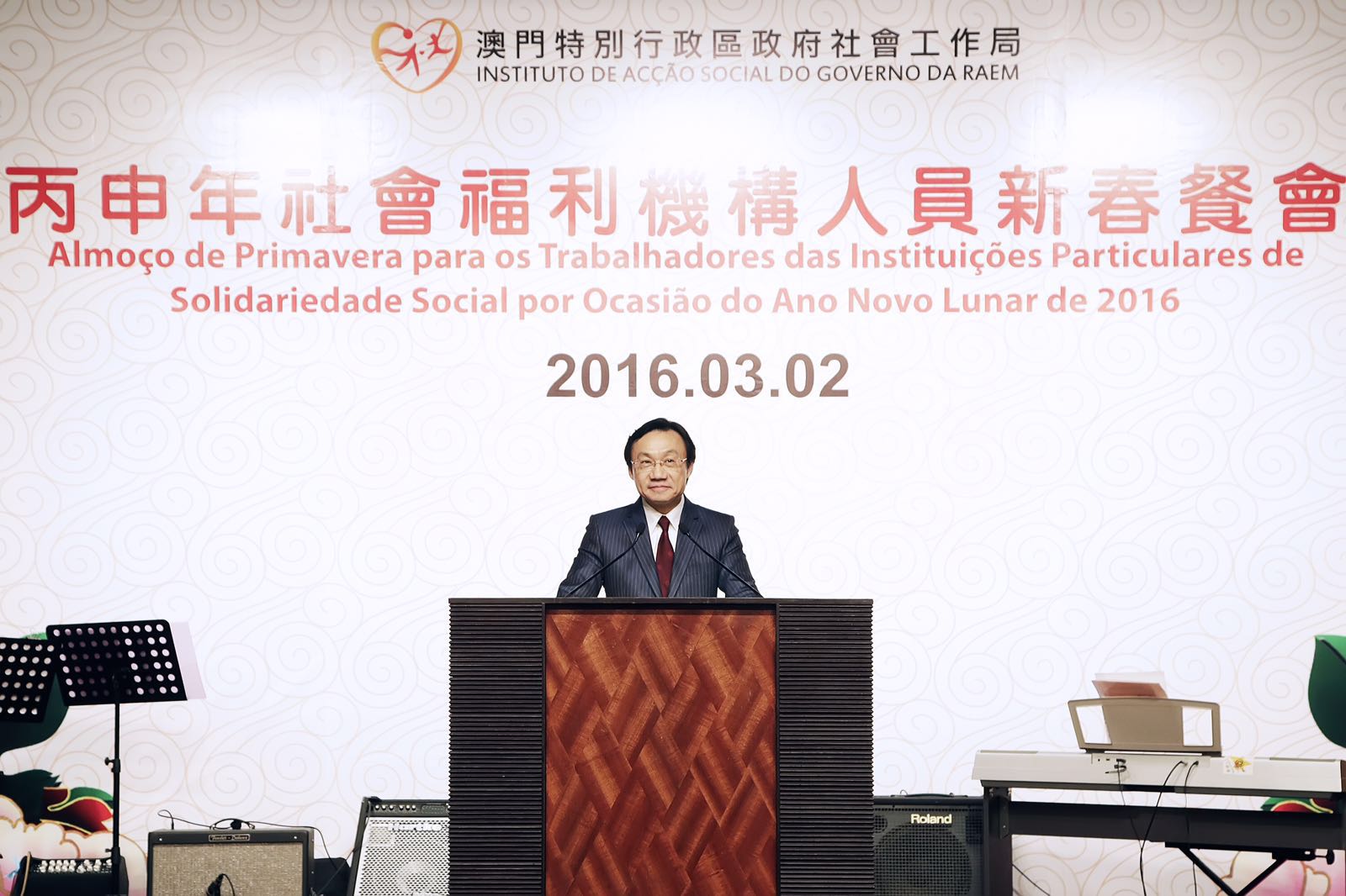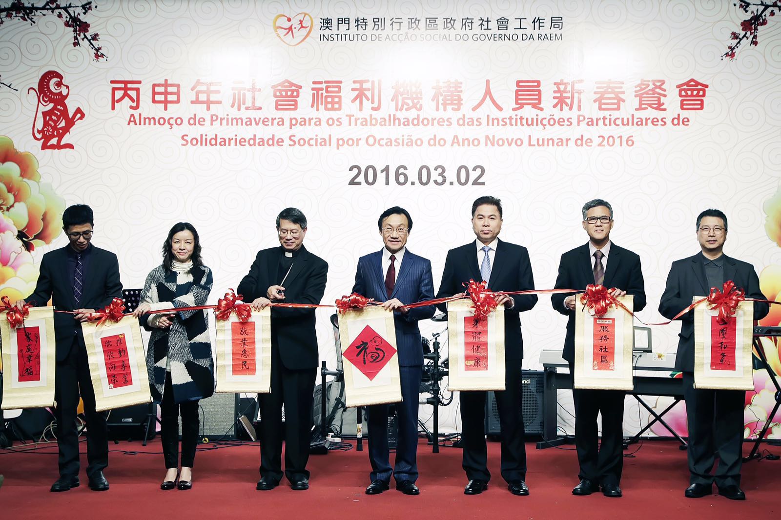 O IAS realizou o “Almoço de Primavera para os Trabalhadores das Instituições Particulares de Solidariedade Social por ocasião do Ano Novo Lunar de 2016” no Restaurante “The Plaza”, para o qual foram convidados, nomeadamente, o Secretário para os Assuntos Sociais e Cultura, Alexis Tam, o Secretário-Geral Adjunto do Gabinete de Ligação do Governo Central na RAEM, também Chefe do Departamento de Serviço Social do mesmo Gabinete, Huang Huagai, o Bispo da Diocese de Macau, D. Stephen Lee, o Chefe do Gabinete do Secretário para os Assuntos Sociais e Cultura, Ip Peng Kin, assessores do Gabinete do Secretário para os Assuntos Sociais e Cultura, Ho Lai Chun da Luz, Wai Cheng Iong, Lo Iek Long e Lam Io Pak, o Director da Direcção dos Serviços para os Assuntos Laborais, Wong Chi Hong, o Presidente do Instituto de Habitação, Arnaldo Ernesto dos Santos, o Presidente do Conselho de Administração do Fundo de Segurança Social, Iong Kong Io, o Director Geral Executivo do Centro de Produtividade e Transferência de Tecnologia de Macau, Shuen Ka Hung, tendo também participado neste evento representantes das instituições particulares de solidariedade social, trabalhadores do IAS e amigos da comunicação social, num total de cerca de 500 pessoas.
