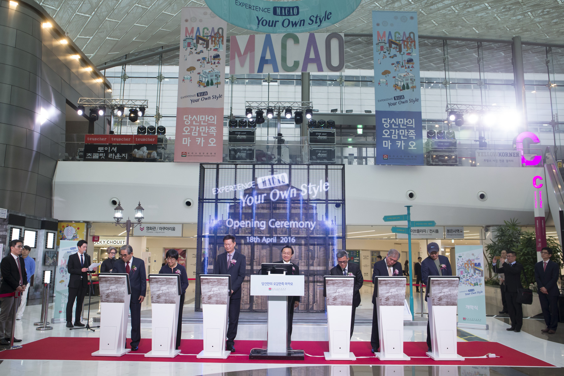 A cerimónia de abertura da promoção “Sentir Macau Ao Seu Estilo” foi realizada hoje no grande centro comercial em Seul COEX MALL. Presidiram à cerimónia, o Secretário para os Assuntos Sociais e Cultura, Alexis Tam, o chefe da Divisão do Turismo Internacional da Organização do Turismo da Coreia, Min Min Hong, o chefe do Gabinete do SASC, Ip Peng Kin, a directora da DST, Maria Helena de Senna Fernandes, o presidente da Associação de Agentes de Viagens da Coreia, Yang Moo Seung, o representante da DST na Coreia, Lew Hwan Kyu, a par com o director de arte e embaixador da LG G5 & Friends, Jang Jin.