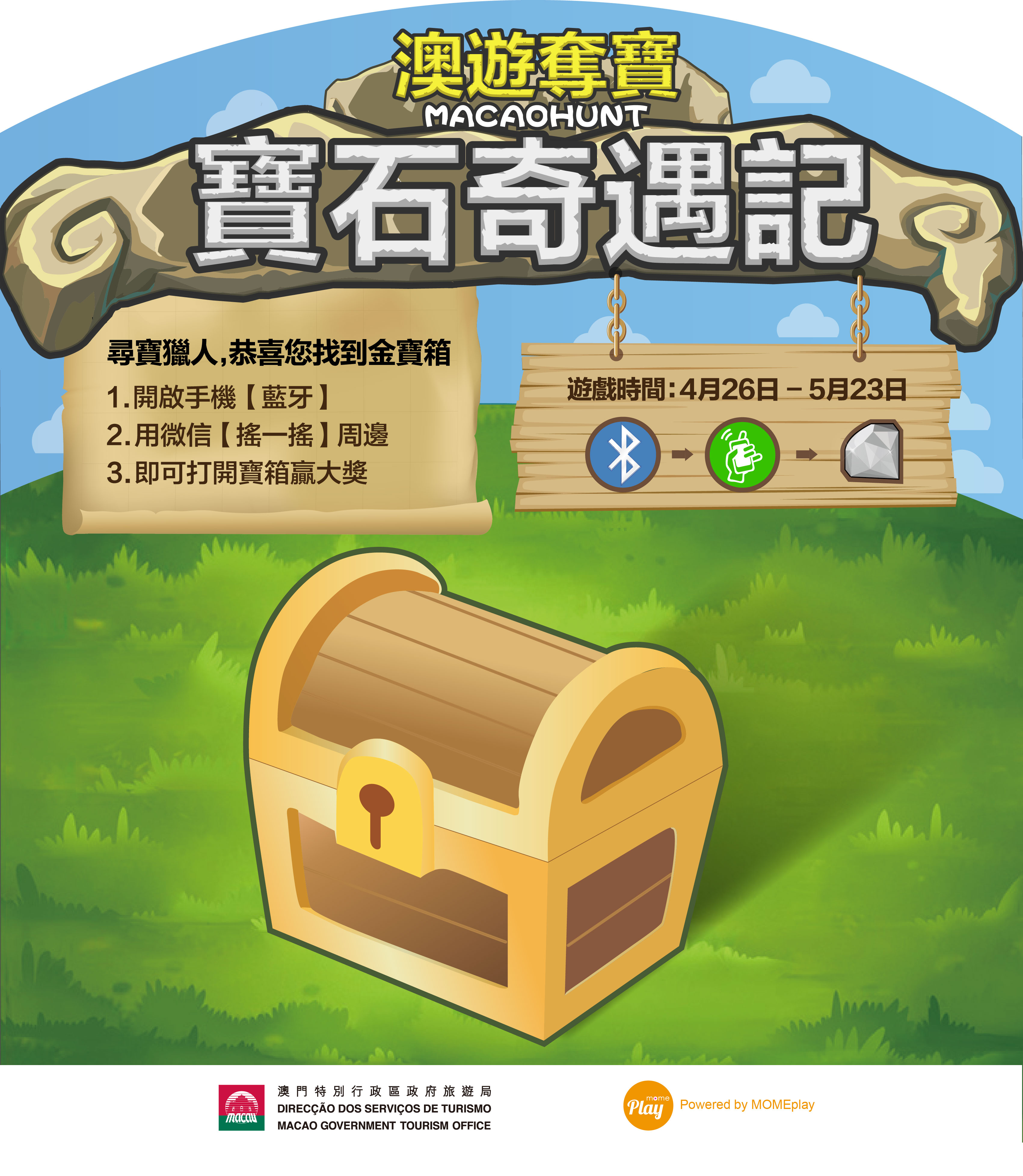 O jogo “Caça ao Tesouro em Macau” tem como tema a procura de pedras preciosas, bastando aos participantes acompanhar o contacto da DST no WeChat (mgtoweixin) para poder participar no jogo e ficar habilitados ao sorteio. Os prémios incluem Macbook, GALAXY S7, iPhoneSE, entre outras atractivas ofertas digitais. Por outro lado, serão colocadas 12 arcas de tesouros em alguns dos pontos de atracção ao longo dos oito roteiros turísticos “Sentir Macau passo-a-passo”. Os participantes têm de deslocar-se aos pontos turísticos designados, procurar as arcas de tesouros e abri-las para coleccionar as pedras preciosas, através das funções “Agite” ou “Leitura” da aplicação para telemóveis inteligentes WeChat, ficando assim habilitados a ganhar cupões dos estabelecimentos de comida do “Programa de Avaliação de Serviços Turísticos de Qualidade” e das lojas de indústrias culturais e criativas localizadas na proximidade que participam no jogo. Aqueles que conseguirem coleccionar as oito pedras preciosas ganham prémios. Os participantes podem ainda aumentar as suas oportunidades no sorteio através do preenchimento de um inquérito e da partilha do link do jogo com os seus amigos no WeChat, caso estes cliquem no link.