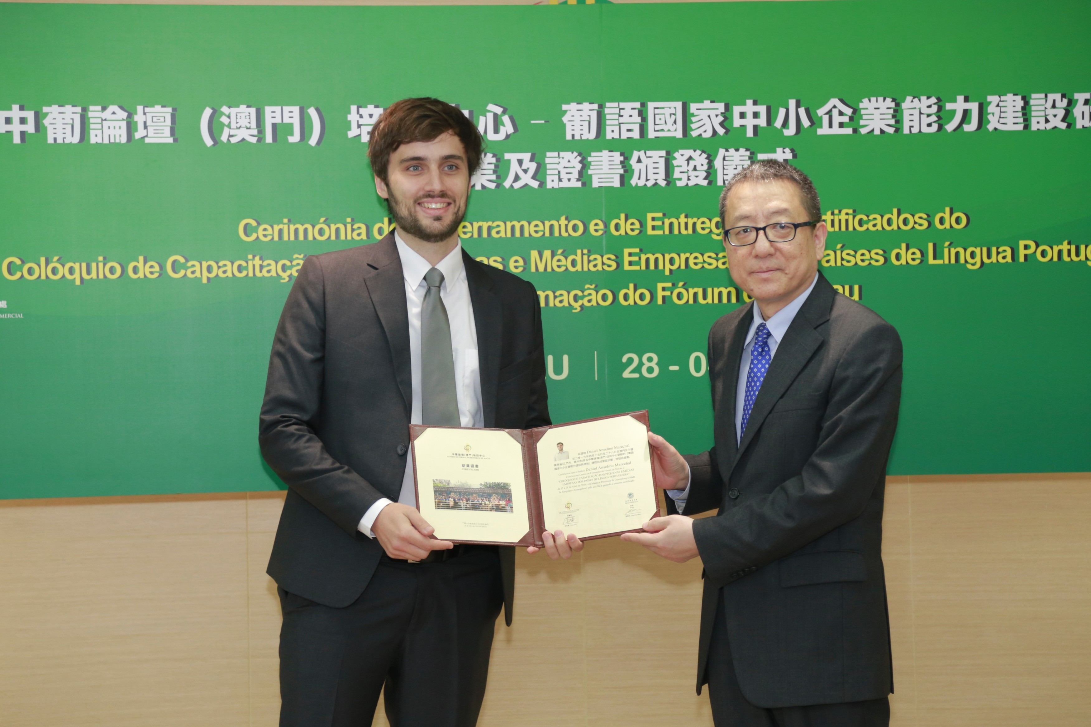 Realizou-se no dia 28 de Abril, no Secretariado Permanente do Fórum para a Cooperação Económica e Comercial entre a China e os Países de Língua Portuguesa (Macau), a “Cerimónia de Encerramento do Colóquio de Capacitação das Pequenas e Médias Empresas dos Países de Língua Portuguesa” do Centro de Formação do Fórum de Macau, ministrado pela Universidade da Cidade de Macau.