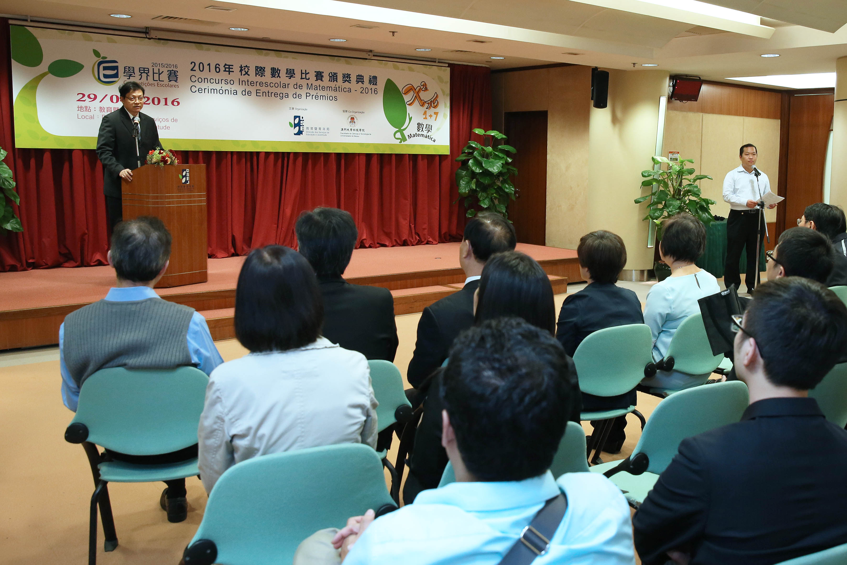 A Direcção dos Serviços de Educação e Juventude (DSEJ), em colaboração com a Faculdade de Ciências e Tecnologia da Universidade de Macau organizou, com êxito, o Concurso Interescolar de Matemática 2016 e realizou, no dia 29 de Abril, a cerimónia de entrega de prémios, na qual estiveram presentes os seguintes convidados: o subdirector, Lou Pak Sang, o subdirector da Faculdade de Ciências e Tecnologia da Universidade de Macau, Wong Pak Kin, o professor auxiliar, Leong Ieng Tak e os directores de várias escolas dos ensinos primário e secundário. Ambas as instituições pretenderam, através deste concurso, promover o espírito de investigação e aprendizagem da matemática dos alunos, melhorar as suas capacidades nesta disciplina e aproveitar a oportunidade para sinalizar os alunos, dos ensinos primário, secundário geral e secundário complementar, com potencialidades para participarem nos concursos de matemática regionais e internacionais e, em simultâneo, reforçar o intercâmbio neste âmbito com os alunos de outras regiões, ampliando, também, os seus horizontes.