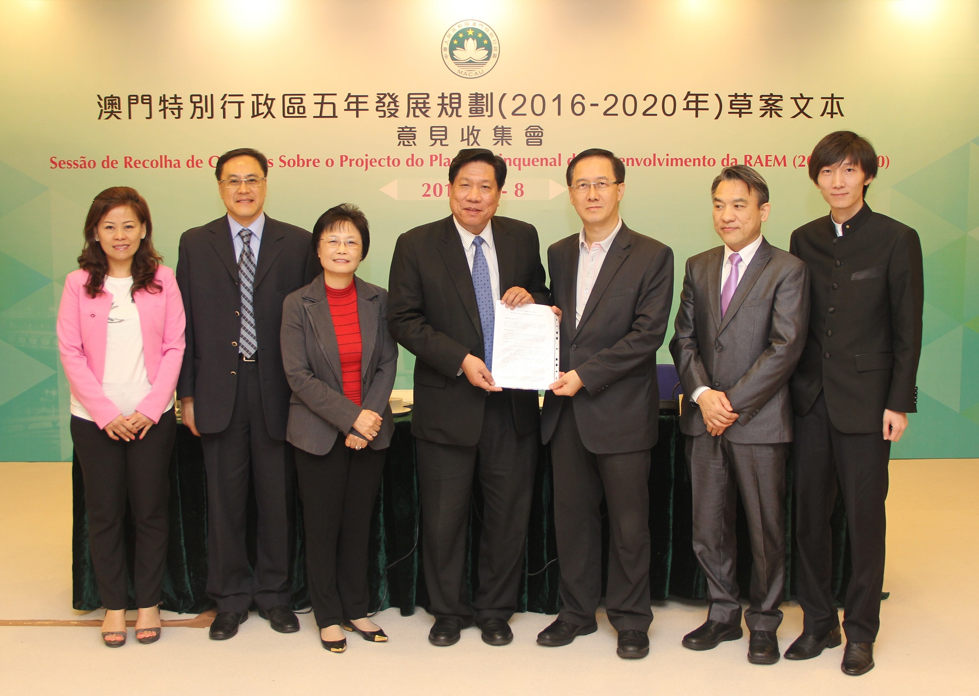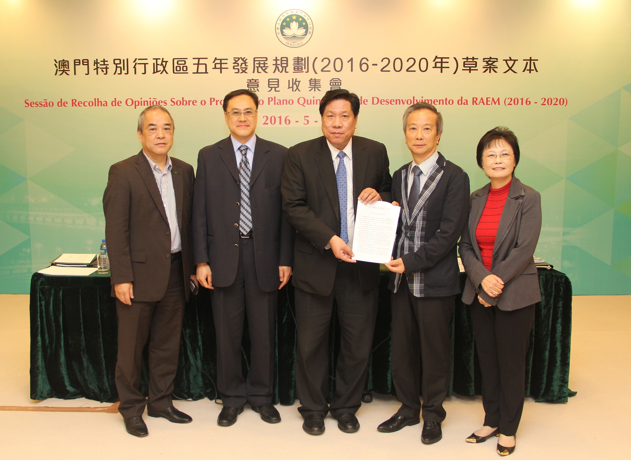 O projecto do Plano Quinquenal de Desenvolvimento da Região Administrativa Especial de Macau (2016-2020) foi já divulgado no passado dia 26 de Abril, tendo assim iniciado os trabalhos da recolha de opiniões, com a duração de 2meses. O Plano Quinquenal é o plano geral de desenvolvimento da RAEM para os próximos cinco anos e o programa de acção de cooperação entre o governo e a população. Assim, uma ampla auscultação junto dos diversos sectores da sociedade, unindo a sabedoria da população e reunindo as forças da sociedade, são factores muito importantes para a definição e concretização do Plano Quinquenal. Neste contexto, o Gabinete de Estudos das Políticas, responsável pelos trabalhos da presente recolha de opiniões, realizou hoje (dia 8), nas suas instalações, a sessão de recolha de opiniões destinada à União Geral das Associações dos Moradores de Macau, Associação Geral das Mulheres de Macau, Associação Geral dos Chineses Ultramarinos de Macau e a Federação da Industria e Comércio de todas as zonas de Macau.