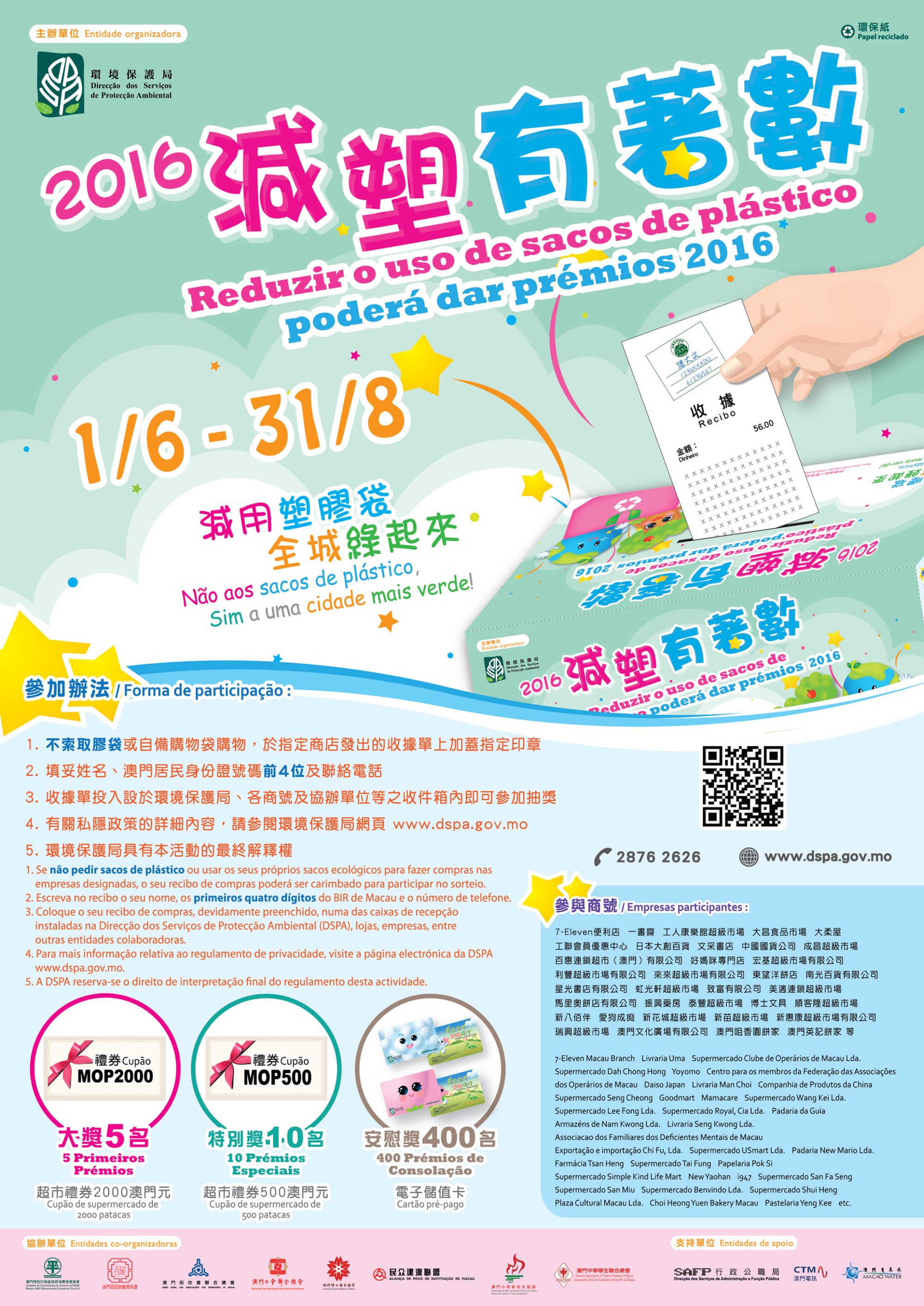 Seja bem-vinda a participação da população no “Festival para comemorar o Dia Mundial do Ambiente 2016 entre duas regiões e cinco cidades”. Para mais informações e detalhes pode ser consultada a página electrónica da DSPA www.dspa.gov.mo ou ligar para a “Linha Ambiental” 2876 2626.