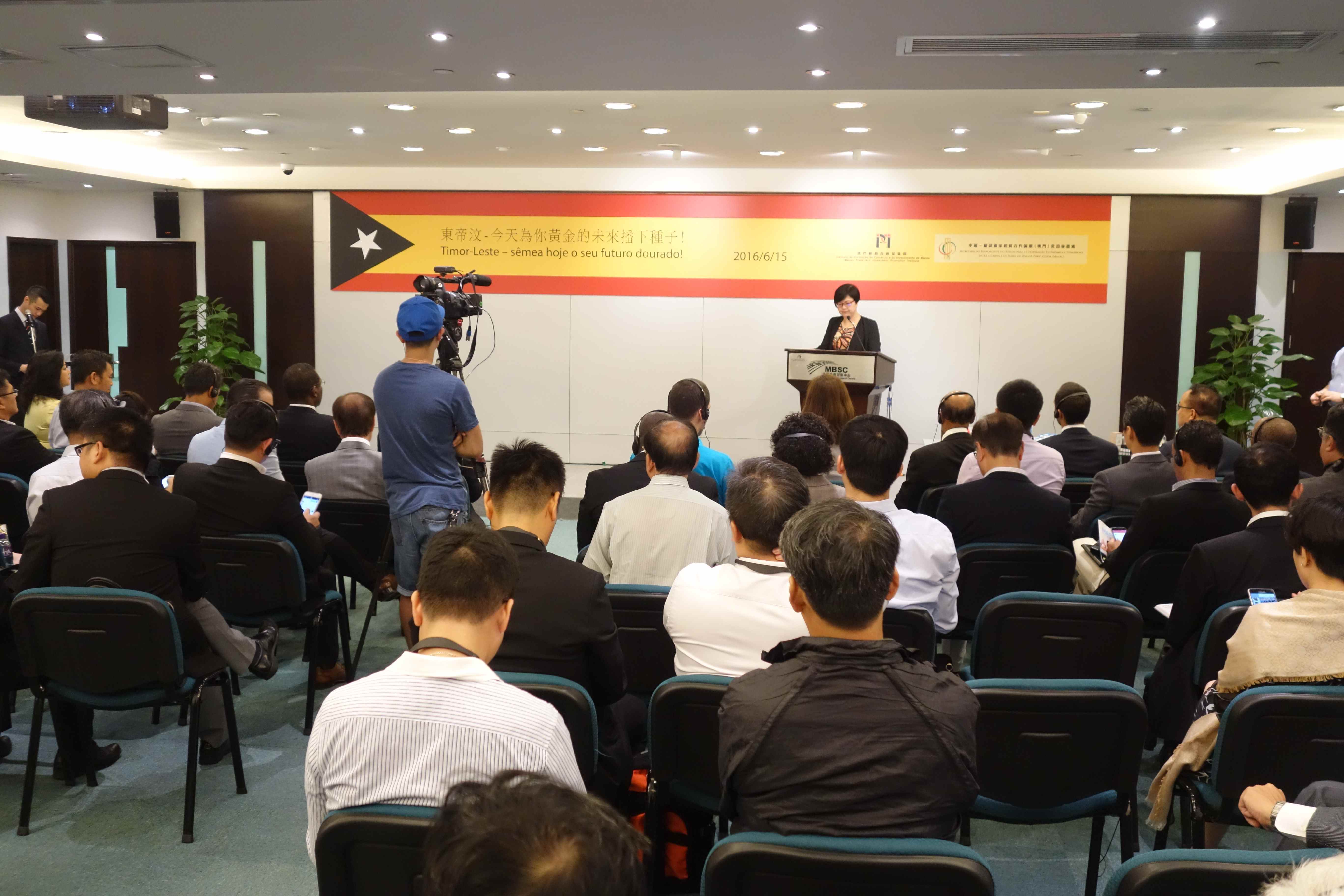 Na sua intervenção proferida no decorrer do referido seminário, a Vogal Executiva do IPIM, Dra. Glória Batalha Ung salientou que, em 2015, as trocas comerciais entre a China e Timor-Leste ultrapassaram a fasquia dos cem milhões de dólares americanos, sendo, maioritariamente, constituídas por exportações da China para aquele país. Destacou que Macau se encontra a desenvolver com o maior dinamismo as suas singulares vantagens de plataforma de serviços para a cooperação económica e comercial entre a China e os Países de Língua Portuguesa, impulsionando o comércio bilateral e o aprofundamento da cooperação, enquanto que continua a promover os serviços de coordeanção económica e comercial e as associações comerciais e câmaras de comércio de Timor-Leste a participarem na Feira Internacional de Macau (MIF, na sigla inglesa) e no Fórum e Exposição Internacional de Cooperação Ambiental de Macau (MIECF, na sigla inglesa), entre outras actividades.