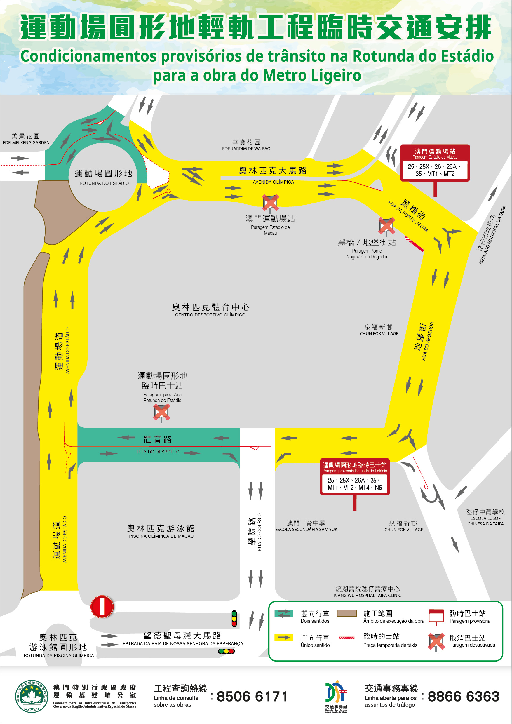 Para manter o sentido do fluxo de tráfego, durante a execução de obra, será implementada uma série de medidas provisórias de trânsito nas áreas da Avenida do Estádio e da Vila da Taipa, nas quais, a Rotunda de Estádio (junta da Avenida Olímpica) e a Rua do Desporto (compreendida entre a Avenida do Estádio e a Rua do Colégio) passarão a funcionar com dois sentidos de circulação; Por outro lado, a Avenida do Estádio, a Avenida Olímpica (junta do Edf. Jardim de Wa Bao), a Rua da Ponte Negra e a Rua do Regedor (compreendida entre a Rua da Ponte Negra e a Rua do Desporto) passarão a ser efectuadas em único sentido de circulação. Os veículos que circulam na Rotunda de Estádio (Edf. Mei Keng Garden), em direcção à Rotunda da Piscina Olímpica precisam de passar a circular na Rua da Ponte Negra, passando pela Rua do Colégio e pela Estrada da Baía de Nossa Senhora da Esperança. Nesse sentido, alguns lugares de estacionamento com parquímetros e lugares de estacionamento de motociclos na Rua da Ponte Negra e na Rua do Desporto precisam de ser suspensos, passarão a ser provisoriamente a nova faixa de rodagem temporária, paragens de autocarro e zona para tomada e largada de passageiros.