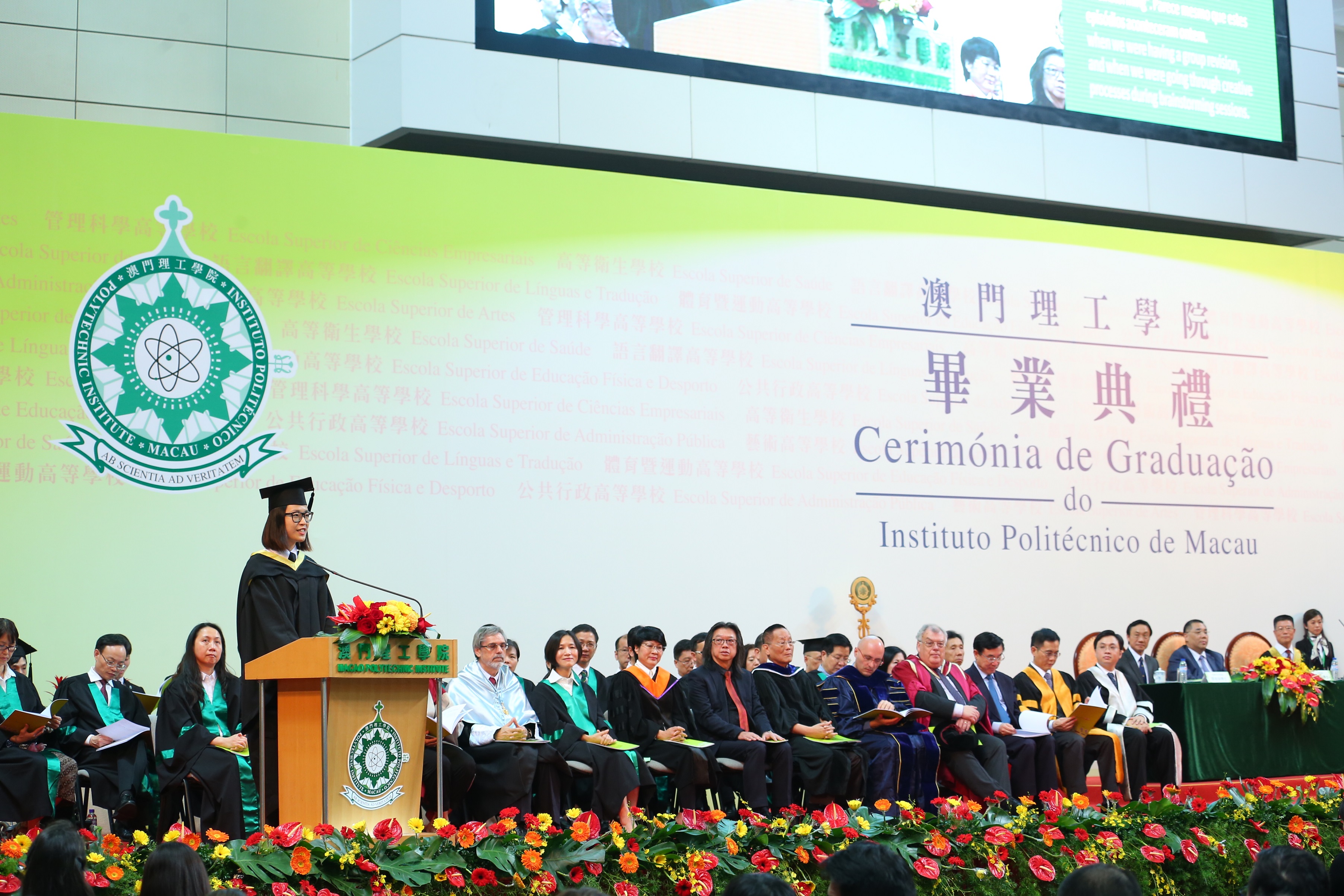A Cerimónia de Graduação teve lugar no Pavilhão Polidesportivo do IPM, na tarde do dia 28 de Junho, tendo contado com a presença do Chefe do Executivo, Doutor Chui Sai On, do Secretário para os Assuntos Sociais e Cultura, Doutor Alexis Tam Chon Weng, do Sub-director do Gabinete de Ligação do Governo Popular Central da RPC na RAEM, Dr. Sun Da, do Sub-Comissário do Comissariado do Ministério dos Negócios Estrangeiros da RPC na RAEM, Dr. Pan Yundong, do Vice-presidente e de deputados à Assembleia Legislativa de Macau, dos membros do Conselho Consultivo do IPM, de representantes dos serviços públicos e das entidades privadas, de directores das escolas secundárias, bem como de familiares e amigos dos alunos graduados. A Cerimónia decorreu em ambiente participativo e muito caloroso.