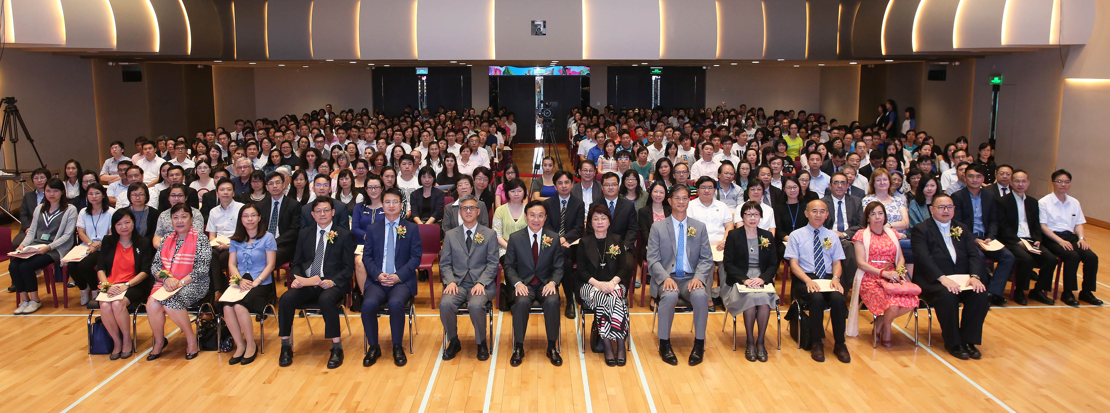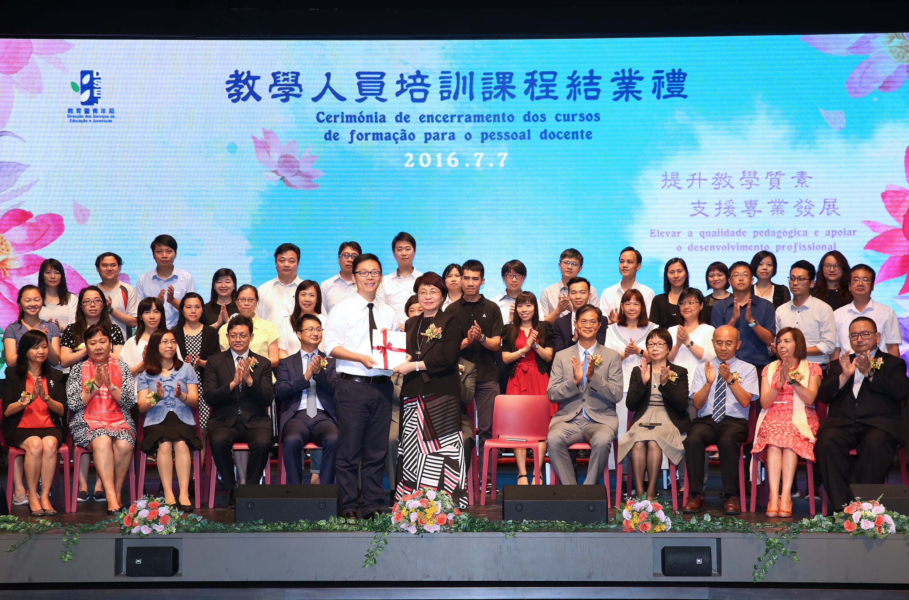 Para partilhar com o pessoal docente os bons resultados e a satisfação alcançada após a conclusão destes cursos e, ao mesmo tempo, incentivar estes profissionais a continuarem os estudos para assim contribuírem para o melhoramento constante da qualidade da educação, a DSEJ realizou a “Cerimónia de encerramento dos cursos de formação para o pessoal docente do ano lectivo de 2015/2016” na tarde do dia 7 de Julho, no Auditório da Escola São Paulo. A referida cerimónia contou com a presença dos seguintes convidados: o Senhor Secretário para os Assuntos Sociais e Cultura, Alexis, Tam Chon Weng, o chefe do Gabinete do Secretário para os Assuntos Sociais e Cultura, Ip Peng Kin, a directora da DSEJ, Leong Lai, o subchefe do Departamento de Cultura e Educação do Gabinete de Ligação do Governo Popular Central na RAEM, Pu Hailong, o assessor do Gabinete do Secretário para os Assuntos Sociais e Cultura, Wai Cheng Iong, os subdirectores da DSEJ, Lou Pak Sang e Kuok Sio Lai, o chefe de secção do Gabinete para os Assuntos de Hong Kong, Macau e Taiwan do Ministério da Educação, Zhang Jun, o director da Faculdade de Educação da Universidade de Macau, Fan Xitao, a directora substituta da Escola Superior de Línguas e Tradução do Instituto Politécnico de Macau, Cui Mingfen, a directora do Departamento de Português da Faculdade de Letras da Universidade de Macau, Maria Fernanda Gil Costa, a presidente da Associação de Educação de Macau, Ho Sio Kam e o presidente da Associação das Escolas Católicas de Macau, Chow Pak Fai, bem como os representantes e formadores das instituições de formação, os directores escolares e mais de 600 docentes que participaram nos cursos.