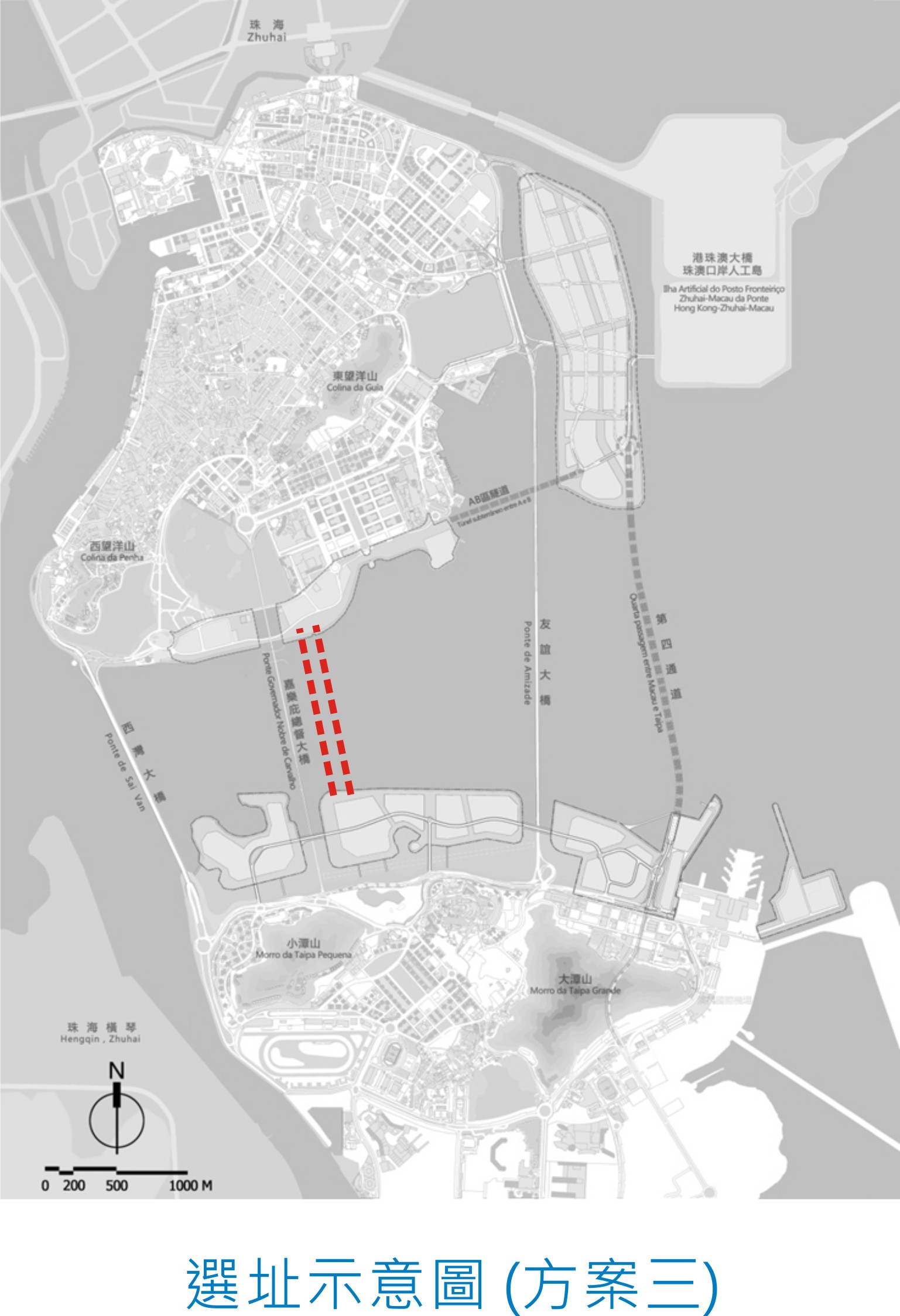 Tendo em consideração de que nesse lugar a distância do mar entre a península de Macau e a ilha da Taipa é mais curta e evitando impactos na Ponte General Nobre de Carvalho e nas paisagens das zonas circundantes, após um estudo preliminar, a DSSOPT acha que é adequada a construção de túneis subaquáticos ao lado da Ponte. Estes túneis ligarão as Zonas C e D dos Novos Aterros Urbanos da Taipa à Zona B dos Novos Aterros Urbanos de Macau. Segundo a estimativa preliminar, cada túnel terá 1 200 metros de comprimento, isto é, metade do comprimento da Ponte General Nobre de Carvalho, e terá, pelo menos, duas faixas de rodagem de sentido único. Um túnel vai em direcção a Macau e outro à Taipa. Há três propostas em relação ao local onde se construirão os túneis, designadamente, nos dois lados da Ponte, no lado oeste da Ponte ou no lado leste da Ponte.