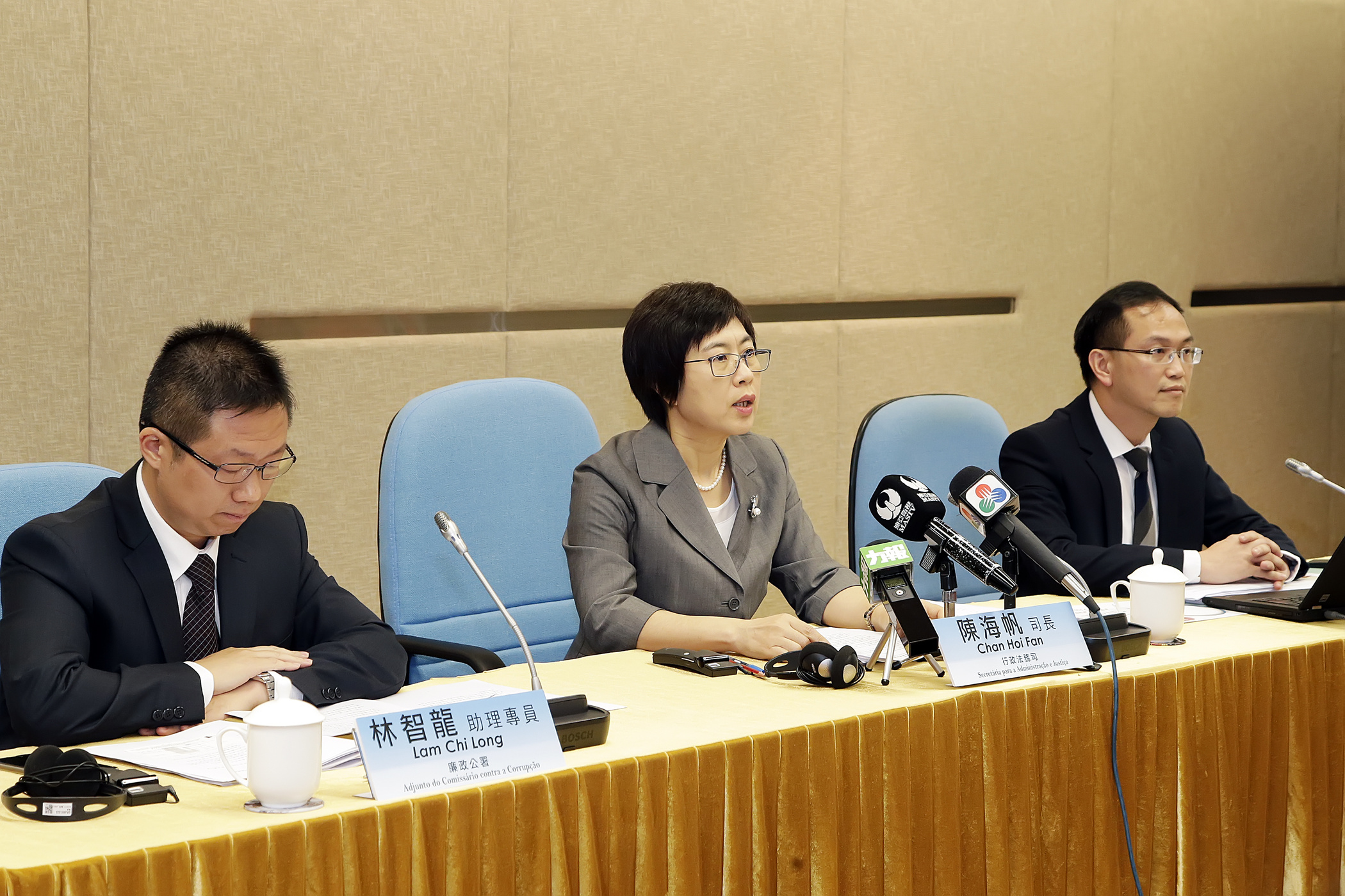 A conferência de imprensa foi presidida pela Secretária para a Administração e Justiça, Chan Hoi Fan, e estiveram presentes o Adjunto do Comissário contra a Corrupção, Lam Chi Long, o Director dos Serviços de Administração e Função Pública, Kou Peng Kuan.