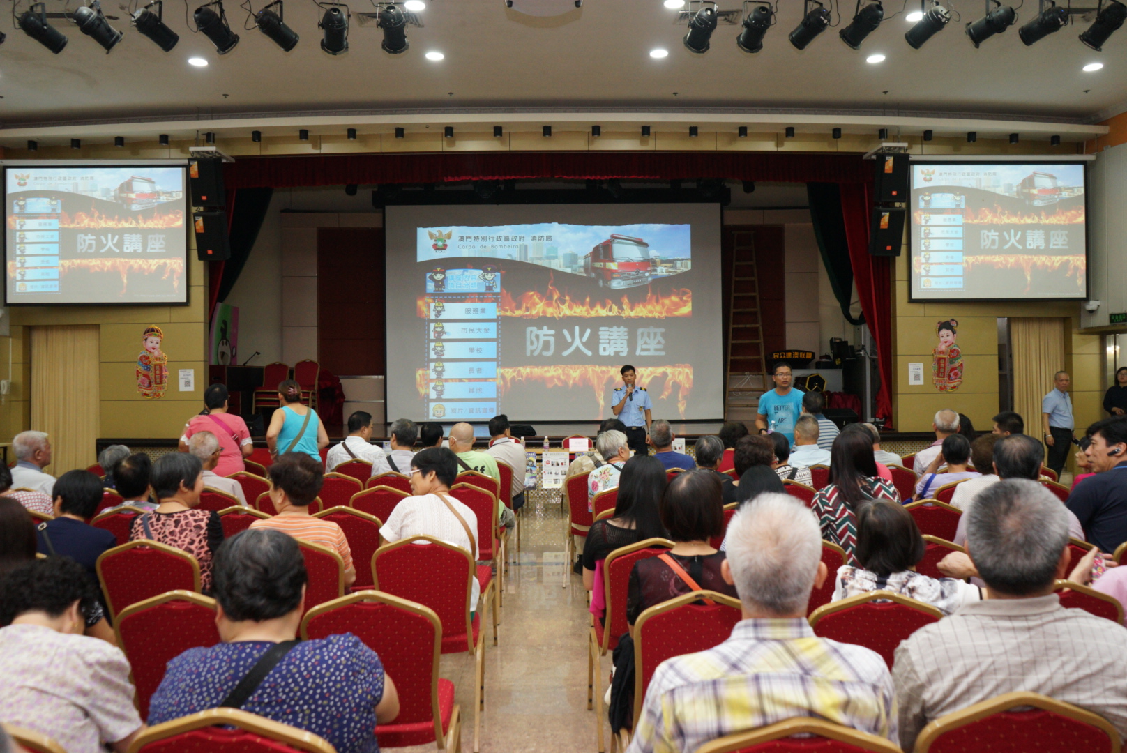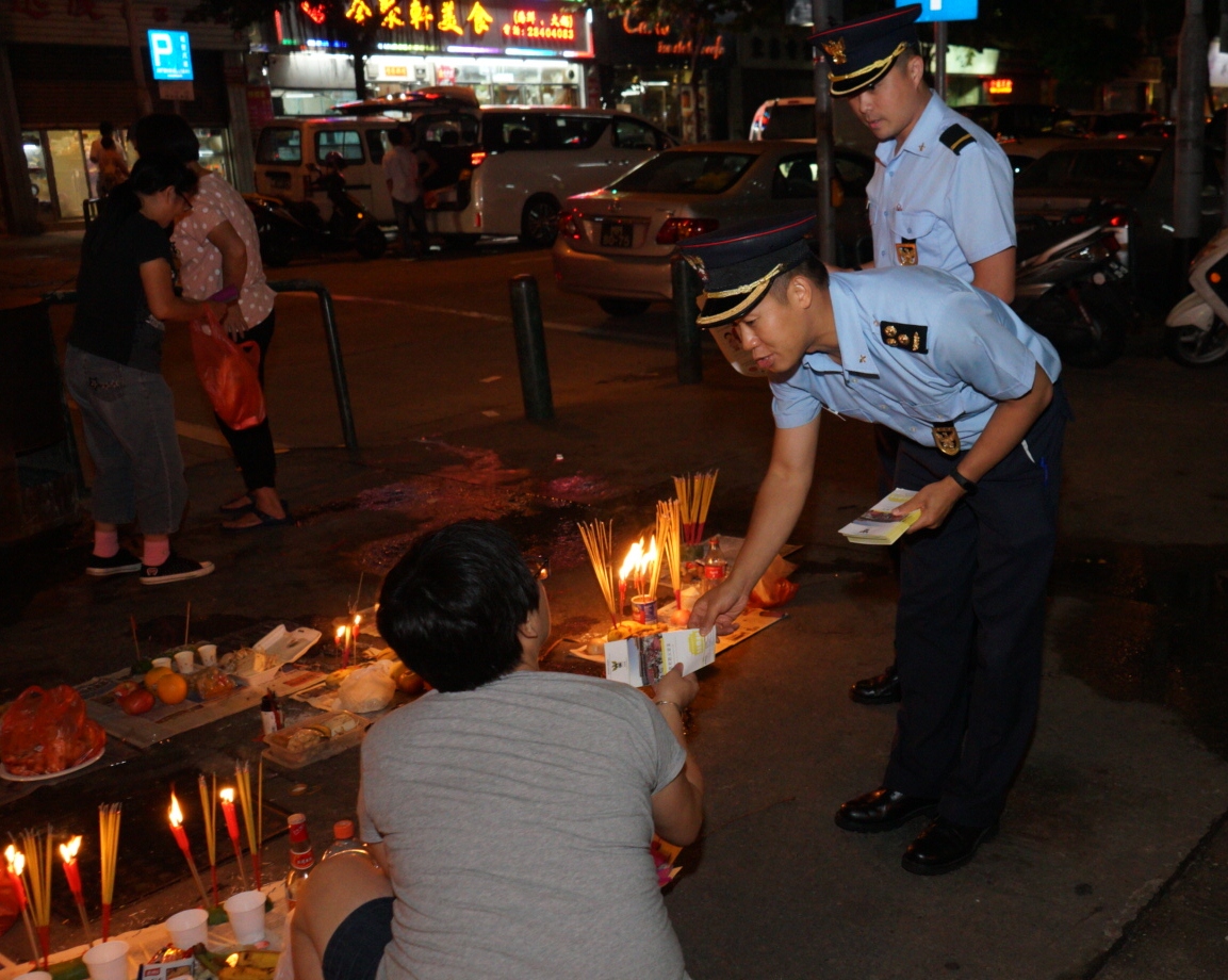 O Corpo de Bombeiros (CB) tem dado grande importância às acções de sensibilização da prevenção contra incêndios, nomeadamente por ocasião de festividades tradicionais e dias com maior risco de fogo. No intuito de reforçar a consciência de prevenção contra incêndios dos residentes no período da Festa dos Espíritos Esfomeados, esta Corporação enviou, respectivamente nos dias 29 de Julho e 4 e 10 de Agosto, os seus oficiais para visitarem a Aliança de Povo de Instituição de Macau e a Associação dos Moradores da Zona de Aterros do Porto Exterior, nas quais foram apresentadas as acções de sensibilização da prevenção contra incêndios no período da Festa dos Espíritos Esfomeados e respectivos trabalhos preparatórios, e foram ouvidas as opiniões sobre as acções de prevenção e combate a incêndios e de salvamento. Durante o período, foram realizadas palestras de protecção contra o fogo e de conhecimentos de emergência médica dedicadas aos membros da Aliança de Povo de Instituição de Macau, depois, com a ajuda dos voluntários, foram distribuídos panfletos e cartazes sobre prevenção de incêndios e não abuso da ambulância aos cidadãos, turistas e lojas em diversas zonas. Durante esta festa tradicional, o CB continuará a visitar a comunidade, inteirar-se das tarefas de protecção do fogo e distribuir panfletos promocionais, no sentido de alertar os moradores a prestar atenção à segurança contra incêndios em acto de culto.